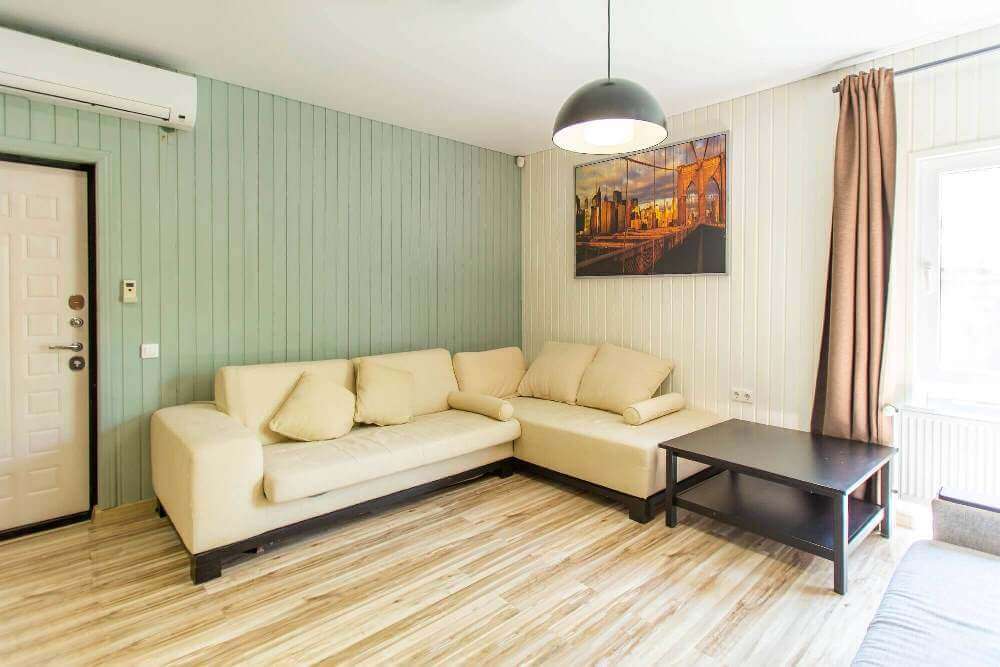 Мебель: двуспальная кровать размер king-size (160см), 2 дивана-кровати, шкаф, прикроватные тумбочки, журнальный столик, стол, стулья, кухонная зона, обеденная зона, зеркало.