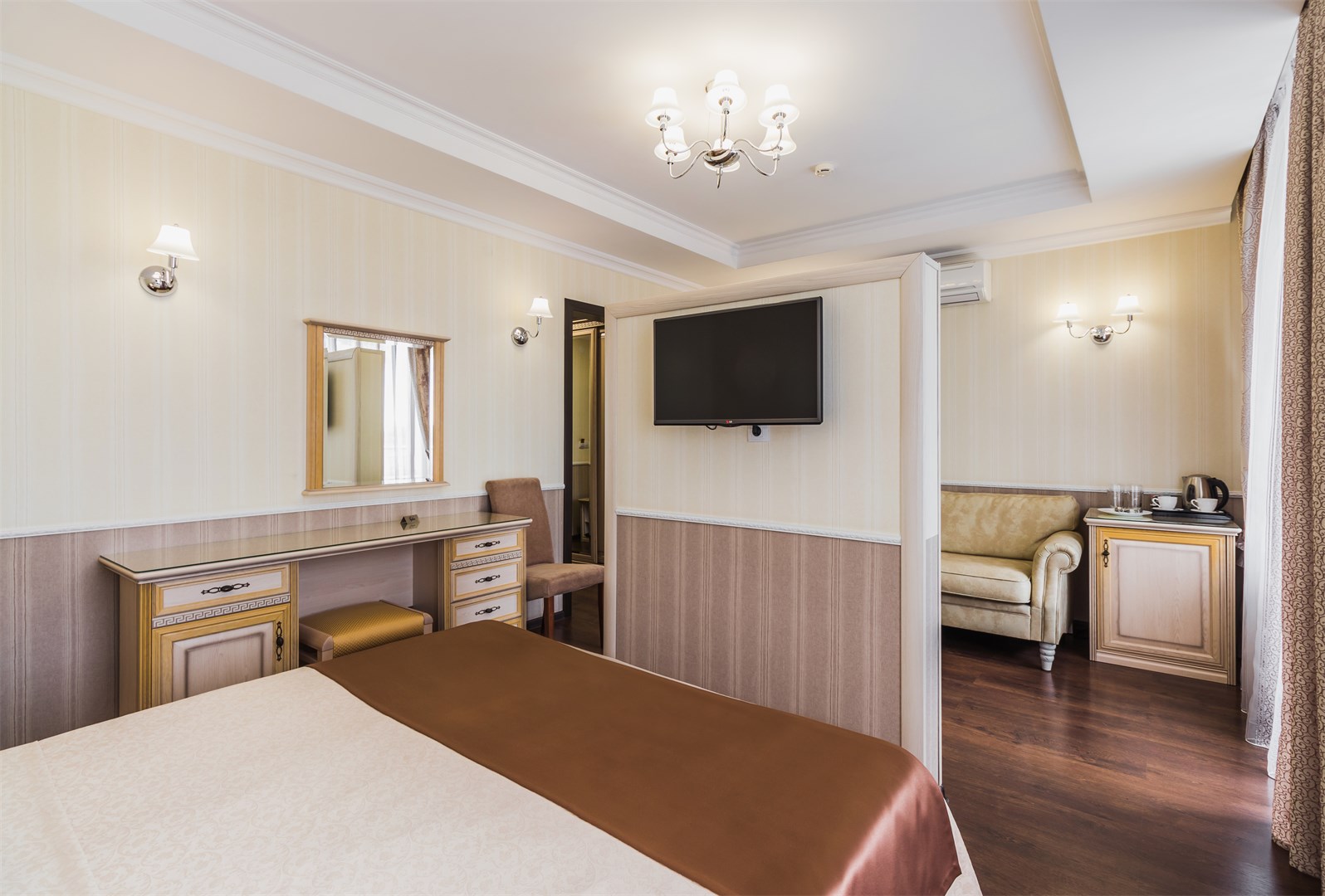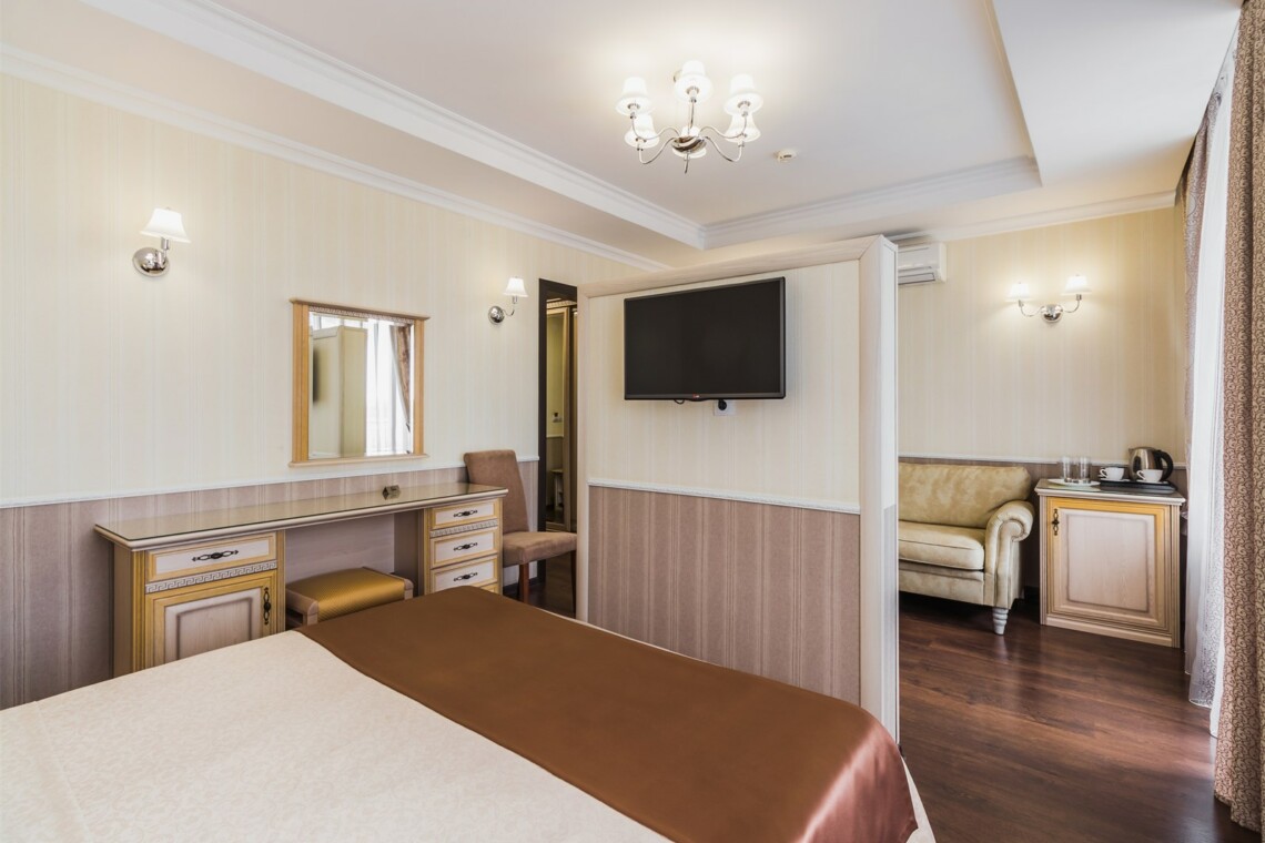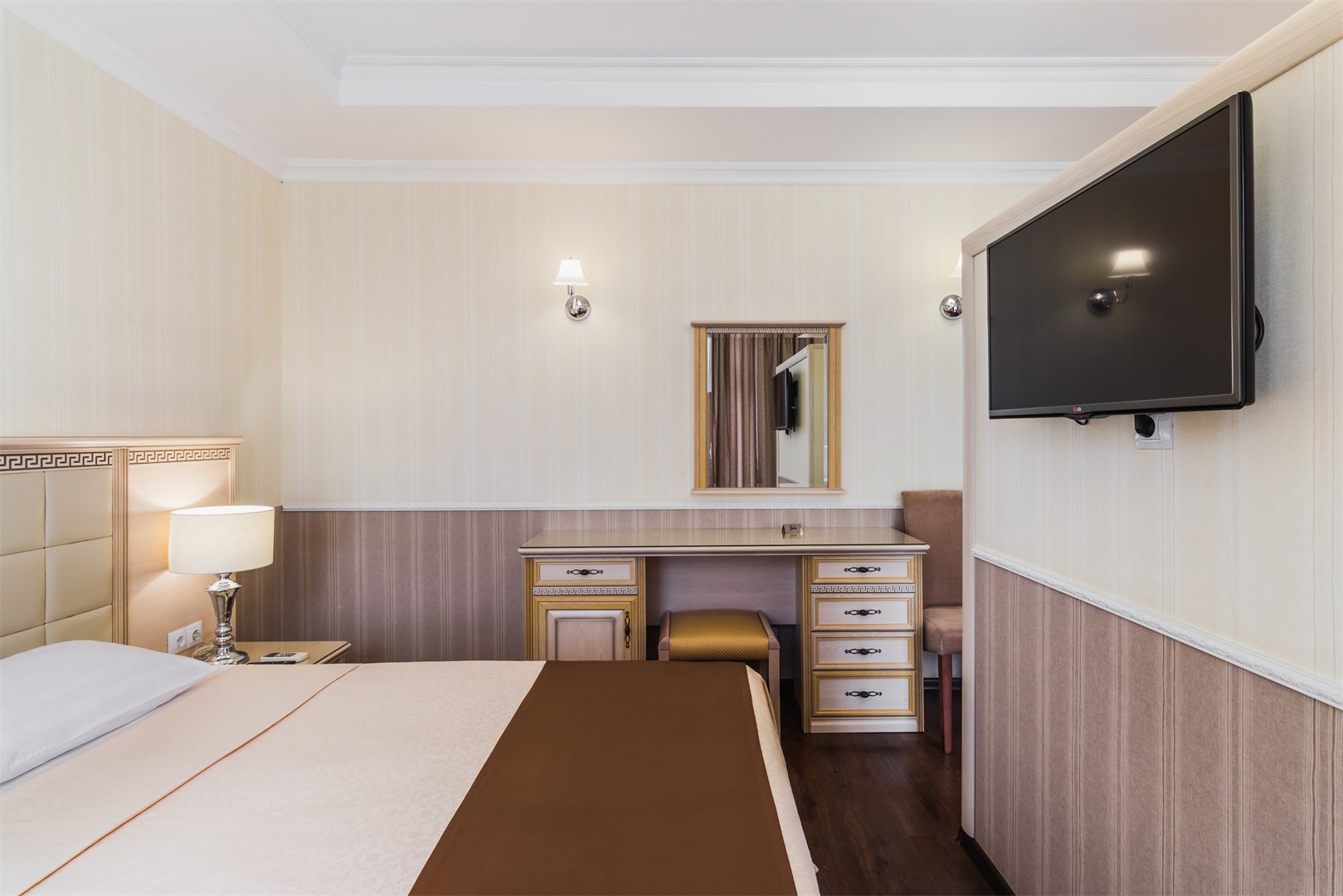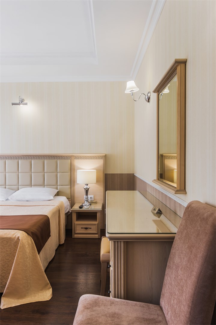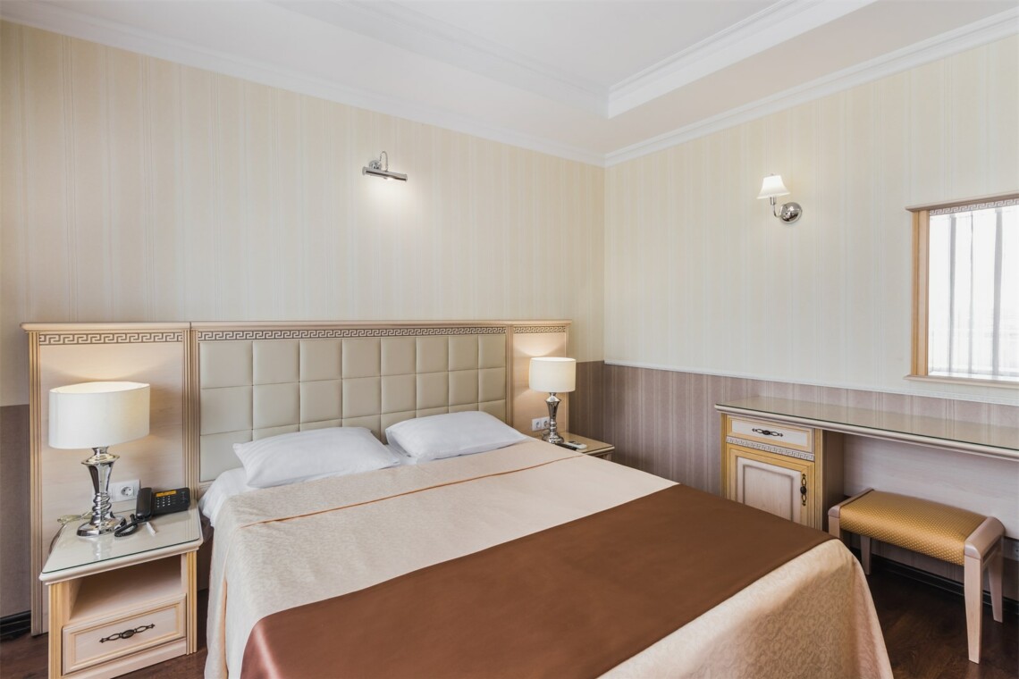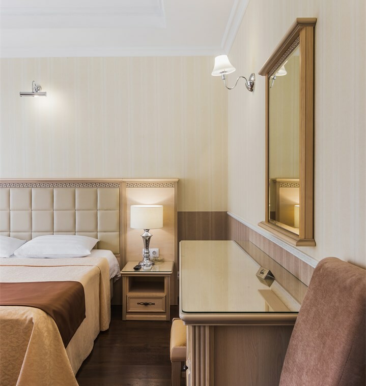 Просторный, светлый номер средней площади 33 кв. м с высокими потолками, большими окнами и роскошным видом на парк имени А.С. Пушкина. выбор для деловой поездки и комфортного отдыха. Два ЖК-телевизора, высокие удобные кровати и белье из шелковистого сатина обеспечат прекрасный сон.