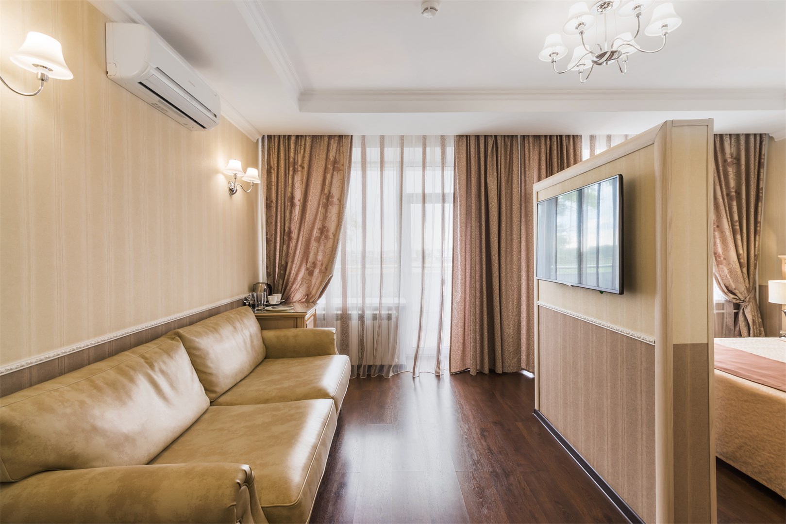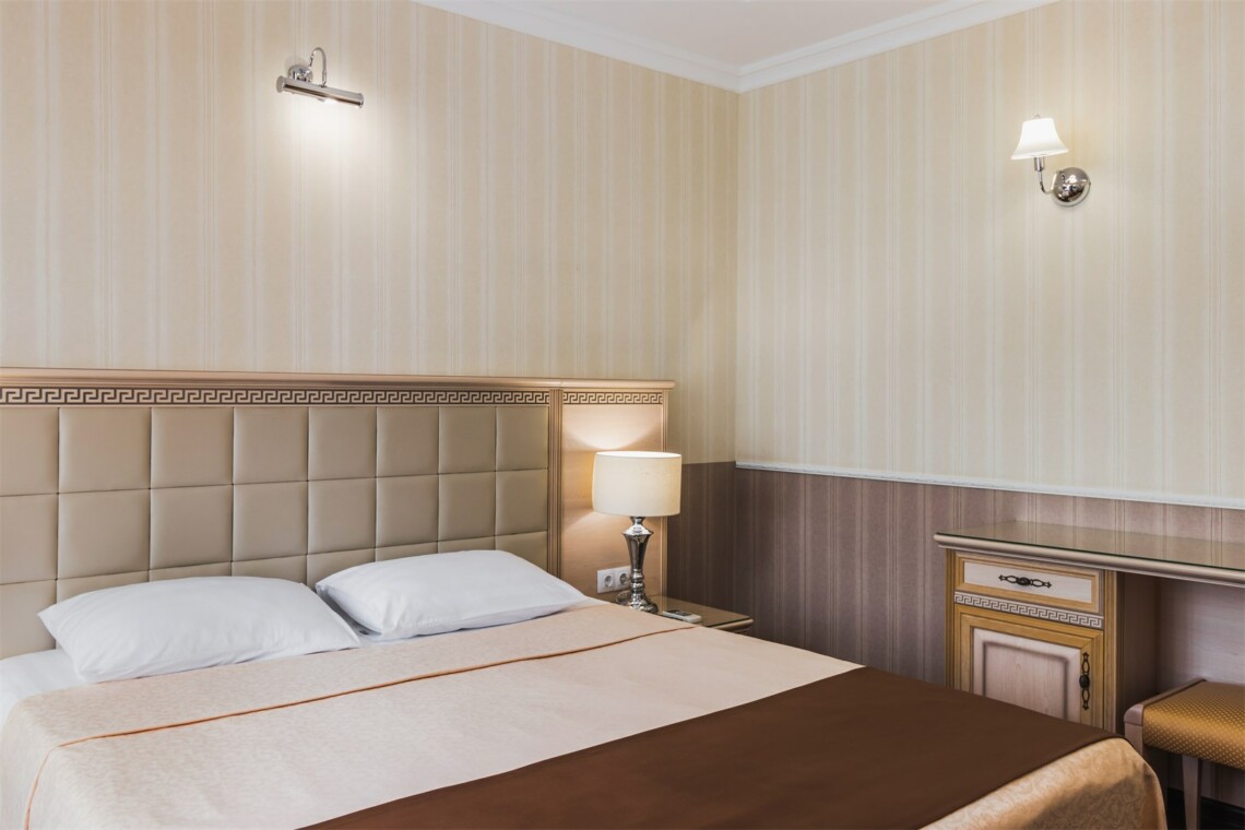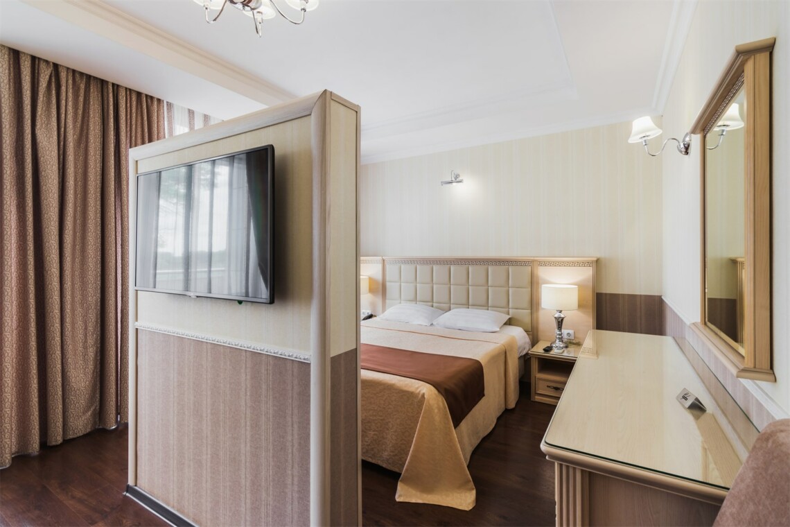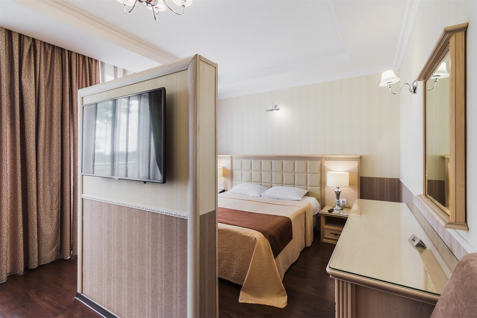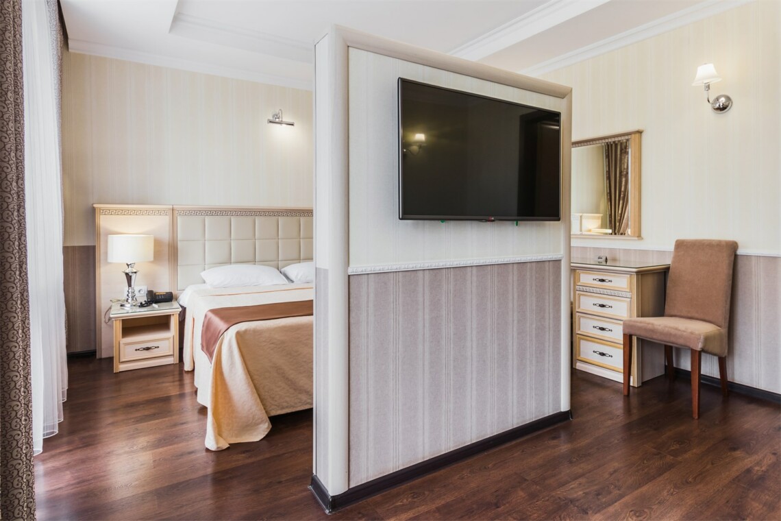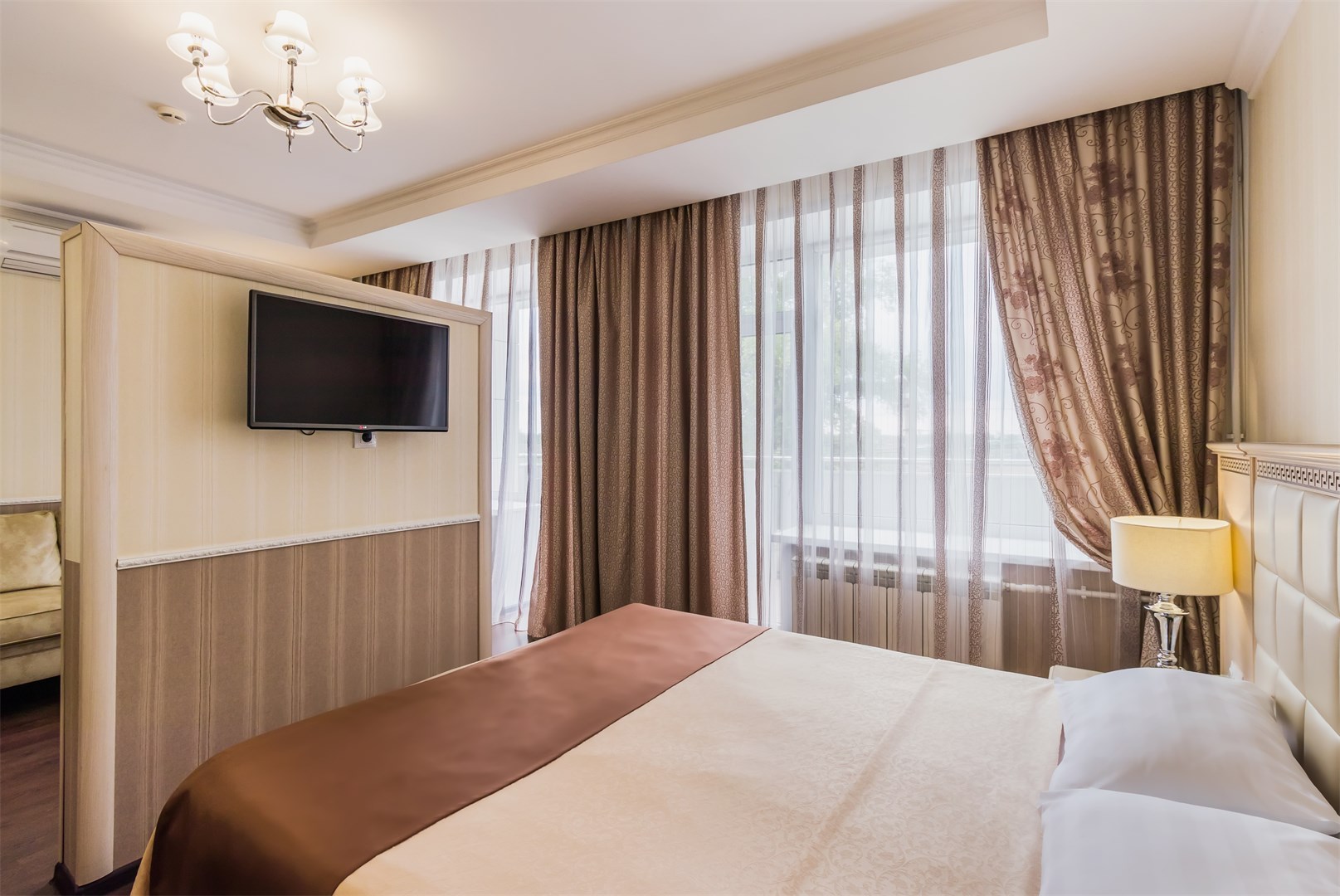 Просторный, светлый номер средней площади 33 кв. м с высокими потолками, большими окнами и роскошным видом на парк имени А.С. Пушкина. выбор для деловой поездки и комфортного отдыха. Два ЖК-телевизора, высокие удобные кровати и белье из шелковистого сатина обеспечат прекрасный сон.