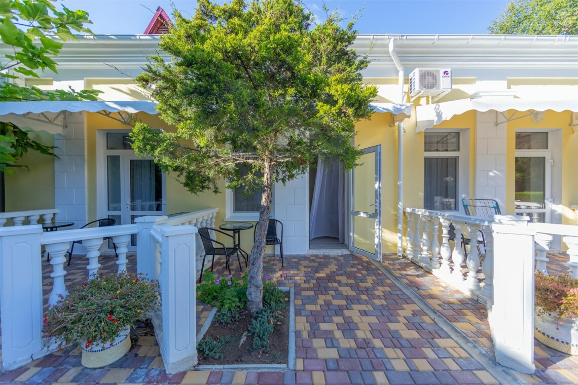 Отель расположен в курортной части города Евпатория. Территория гостиничного комплекса, это уютная и ухоженная парковая зона. Тщательно отреставрированные корпуса отеля, являются историческими памятниками архитектуры, в которых расположены 114 комфортабельных номеров различных категорий. В парк-отеле «Романова» есть все необходимое для комфортного, интересного и приятного семейного отдыха в Крыму: бассейн, благоустроенный пляж, ресторан, анимация. Мы умело сочетаем качественный сервис и гостеприимство для наших гостей. Приглашаем и Вас отдохнуть в городе-курорте Евпатории в отеле «Романова»! Просторные номера повышенной комфортности с подвесным этажом и кухонной зоной, общей площадью 45 м2. В номерах есть Wi-Fi, кондиционер, телевизор, фен, сейф и необходимая мебель: на втором этаже одна двуспальная кровать, комод; на первом этаже – двухместный диван и два кресла, журнальный столик, одёжный шкаф, кухонная зона. В номере предусмотрено три дополнительных места: диван-кровать и кресло-кровать. При размещении с маленькими детьми, бесплатно предоставляется детская кроватка. Номера расположены на первом этаже с отдельным входом через террасу. На террасах установлены кресла и столик. Фотографии на сайте представлены визуализация номера и будет сделано максимально приближённо к этому.