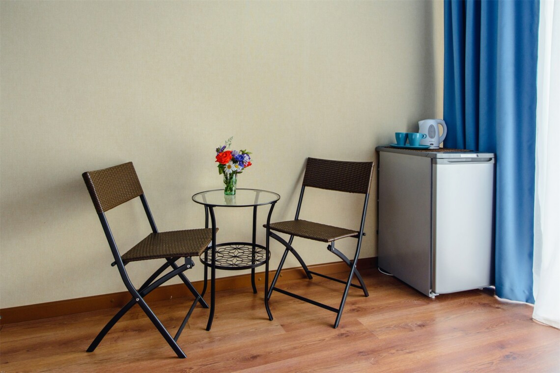 Каждый номер оснащен сплит-системой, полноценным холодильником, телевизором с плоским экраном и чайником с чайными принадлежностями. Ванная комната укомплектована душевой кабиной, феном и бесплатными туалетно-косметическими принадлежностями. Доступные типы кроватей: 1 двуспальная кровать, шириной 1,60м. В каждом номере есть диван (1,40м) с возможностью размещения 1 человека на дополнительном месте.