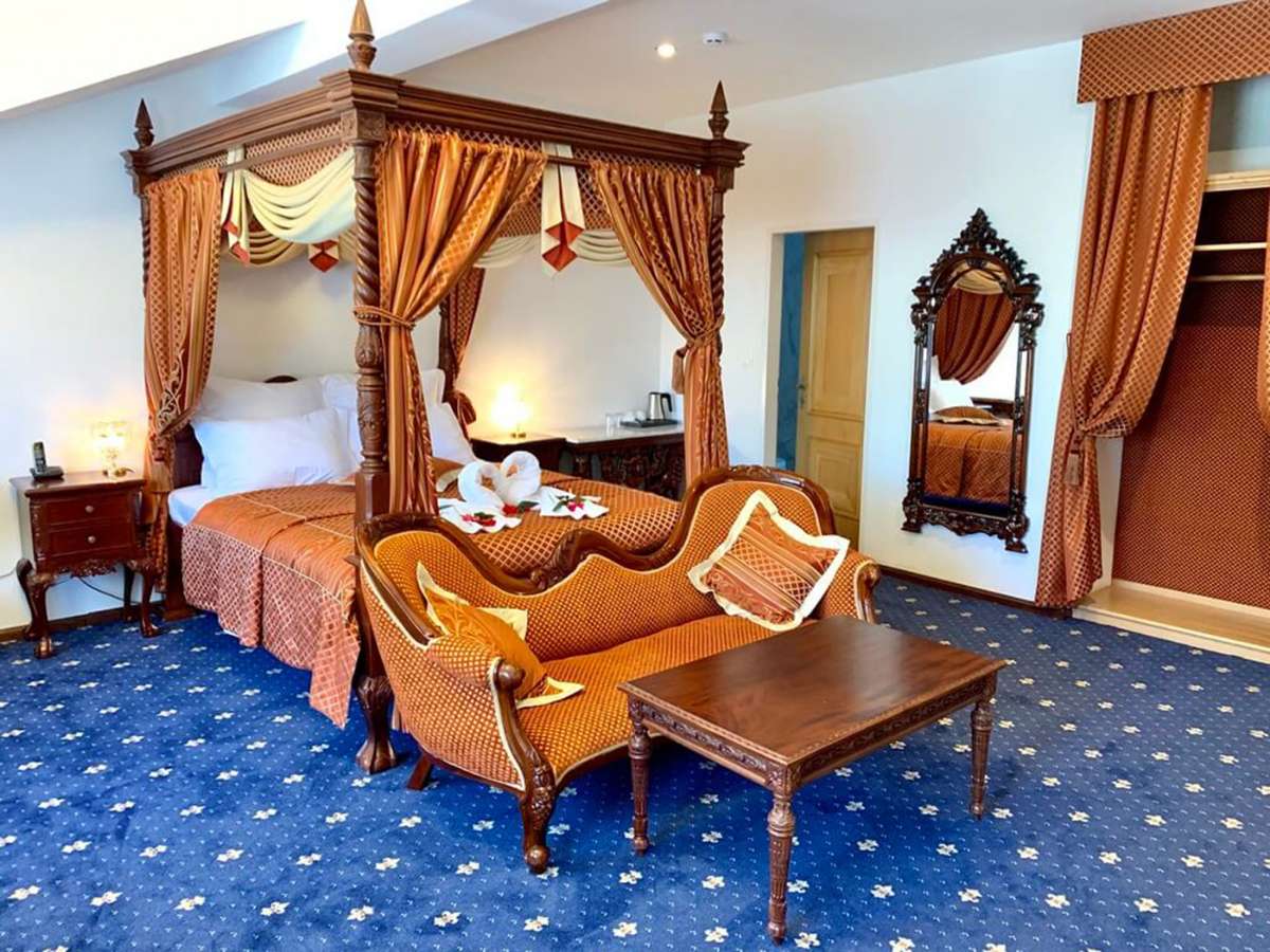 Номера категории “Делюкс” – это просторные авторские номера, каждый с уникальной и роскошной мебелью, которые удивят даже самого взыскательного гостя. Предоставляется бесплатная детская кроватка по запросу.