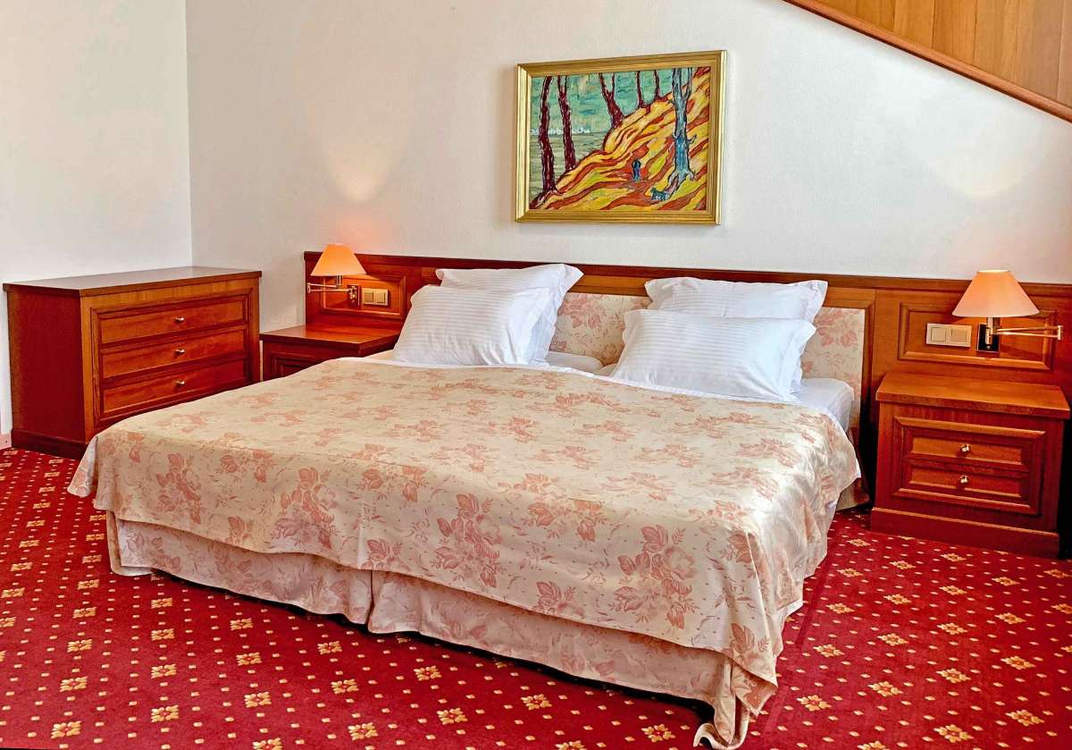 Роскошный номер повышенной категории «Люкс со смежными комнатами» состоит из одной просторной комнаты, разделенной перегородкой на спальную и гостевую зоны. Улучшенное оснащение номером, мебель высочайшего и качественного объема поступлений.
