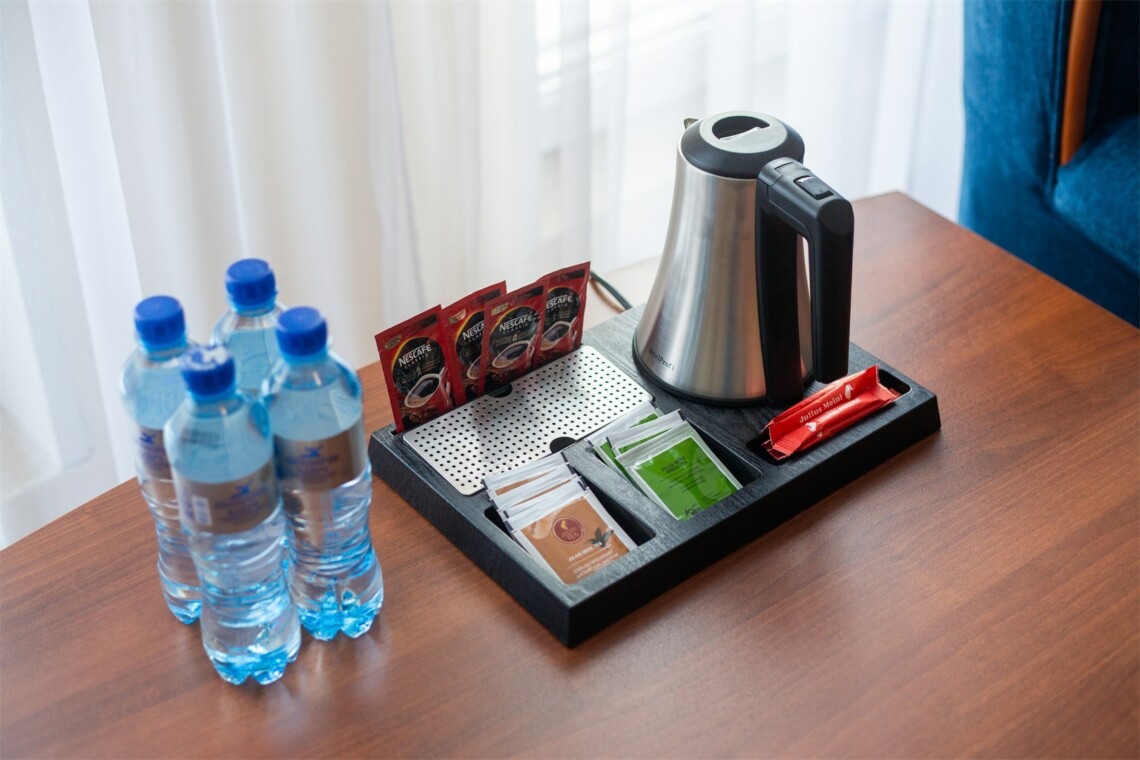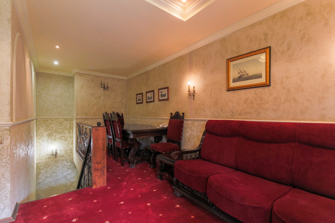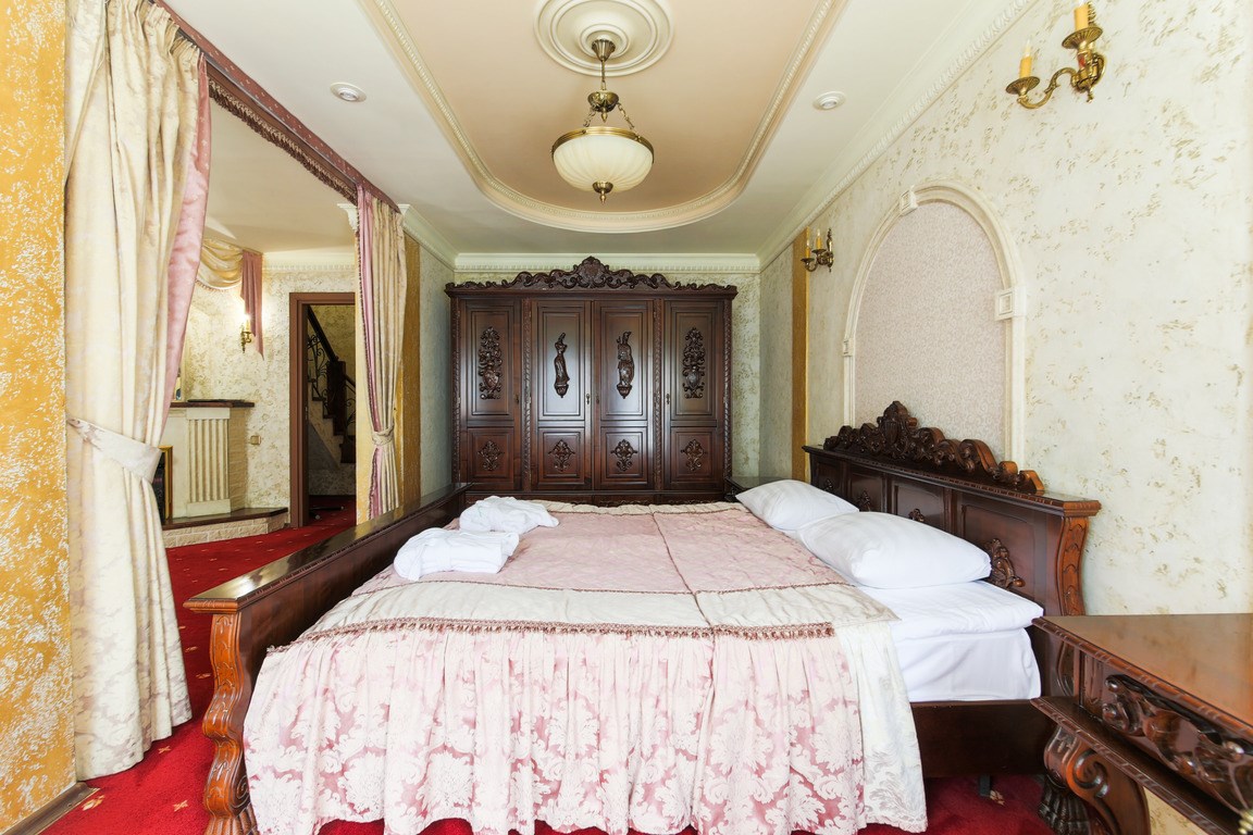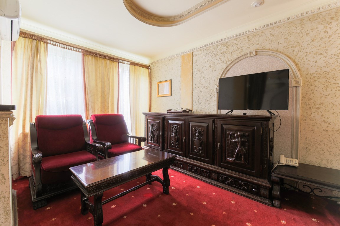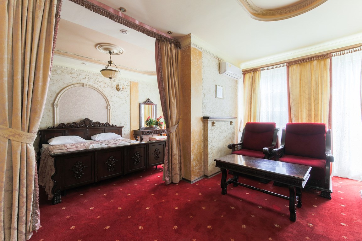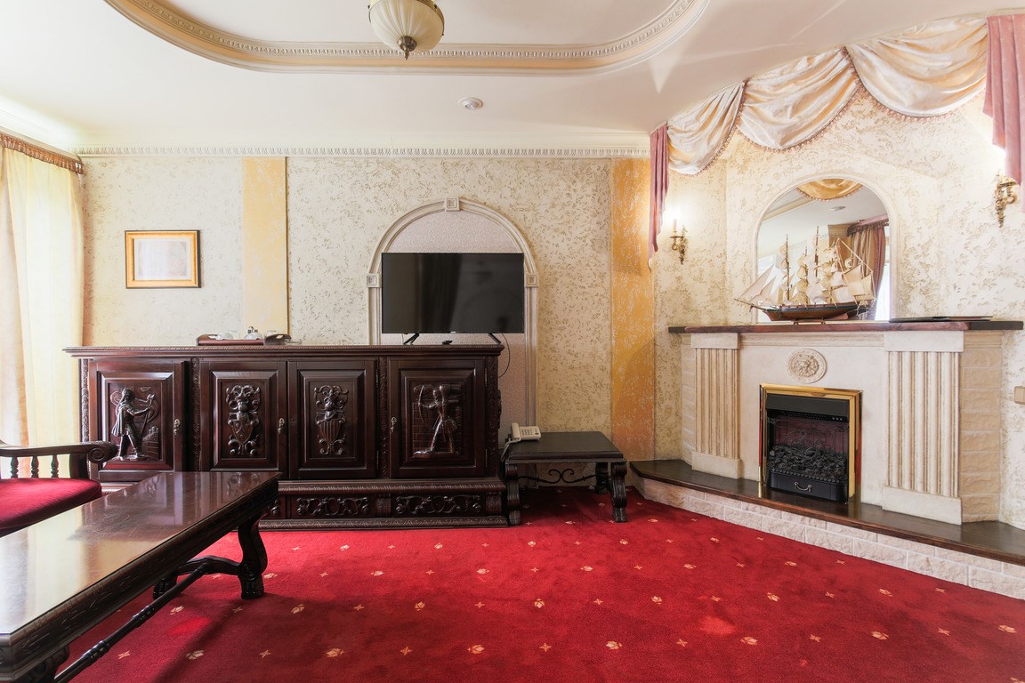 Люкс «Марко Поло» — Тема массового уничтожения венецианского купца Марко Поло, овеянной романтикой дальних странствий и приключений. Двухэтажный номер. В прихожей: вешалка для одежды. На первом этаже: разделенная на две зоны спальня: спальня с большой двуспальной кроватью и платяным шкафом и гостиная — два кресла, журнальный столик, комод, плазменный телевизор, имитация камина, мини-холодильник, балкон. На втором этаже: комната с обеденной группой — диван с креслами, раскладной диван, плазменный телевизор, радиотелефон. В ванной комнате: красивая угловая ванна, фен, комплект полотенец, туалетные принадлежности, халаты, тапочки.