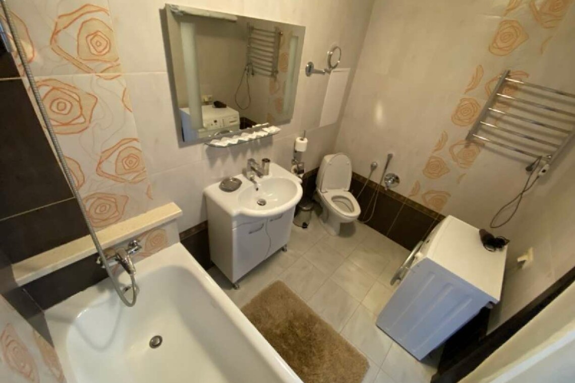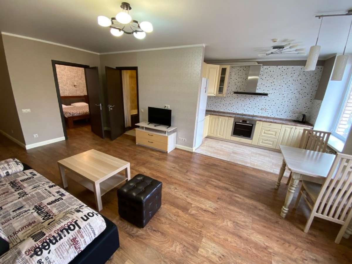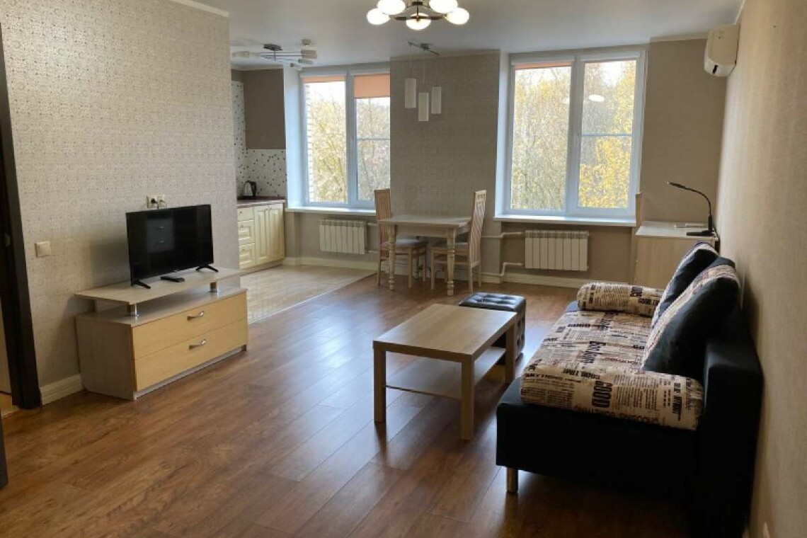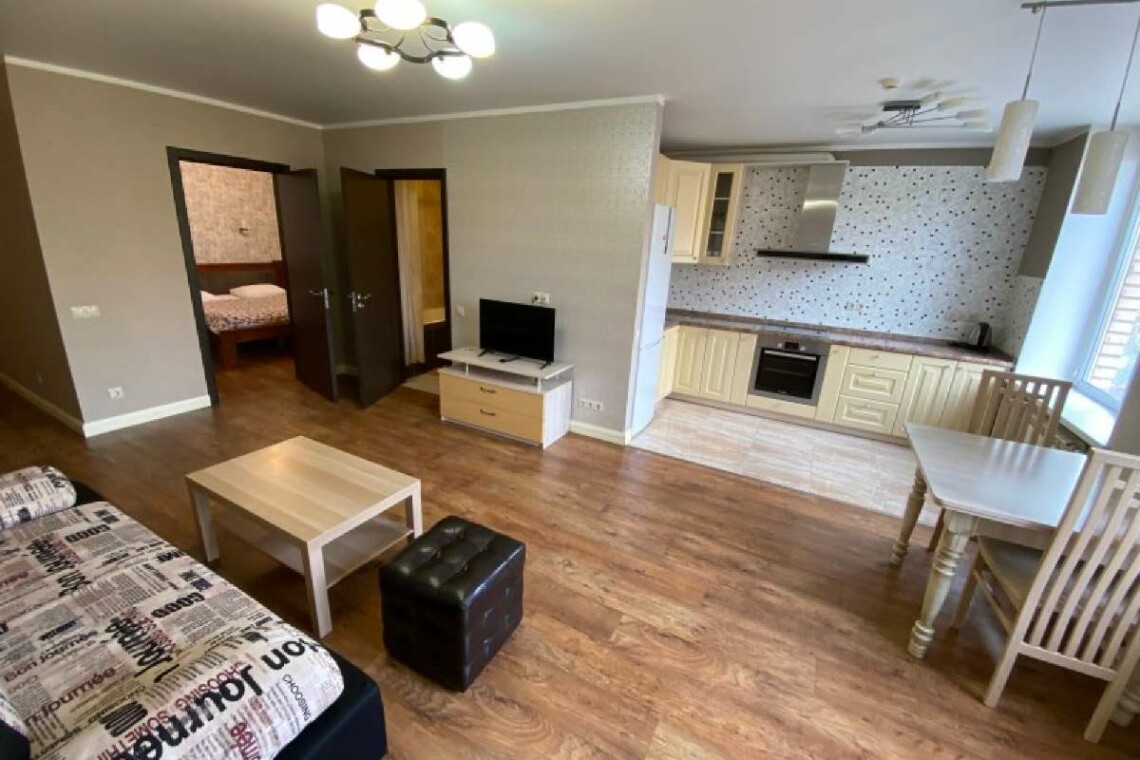 Двухкомнатный номер с кухней общей площадью 56 м.кв. Включает: шкаф, кровать 180*200 см, прикроватные тумбы, диван, телевизор, кухонную мебель, плиту, холодильник, чайник и фен. Санузел с ванной.