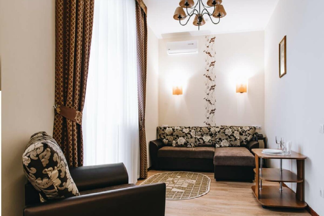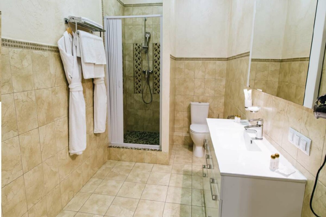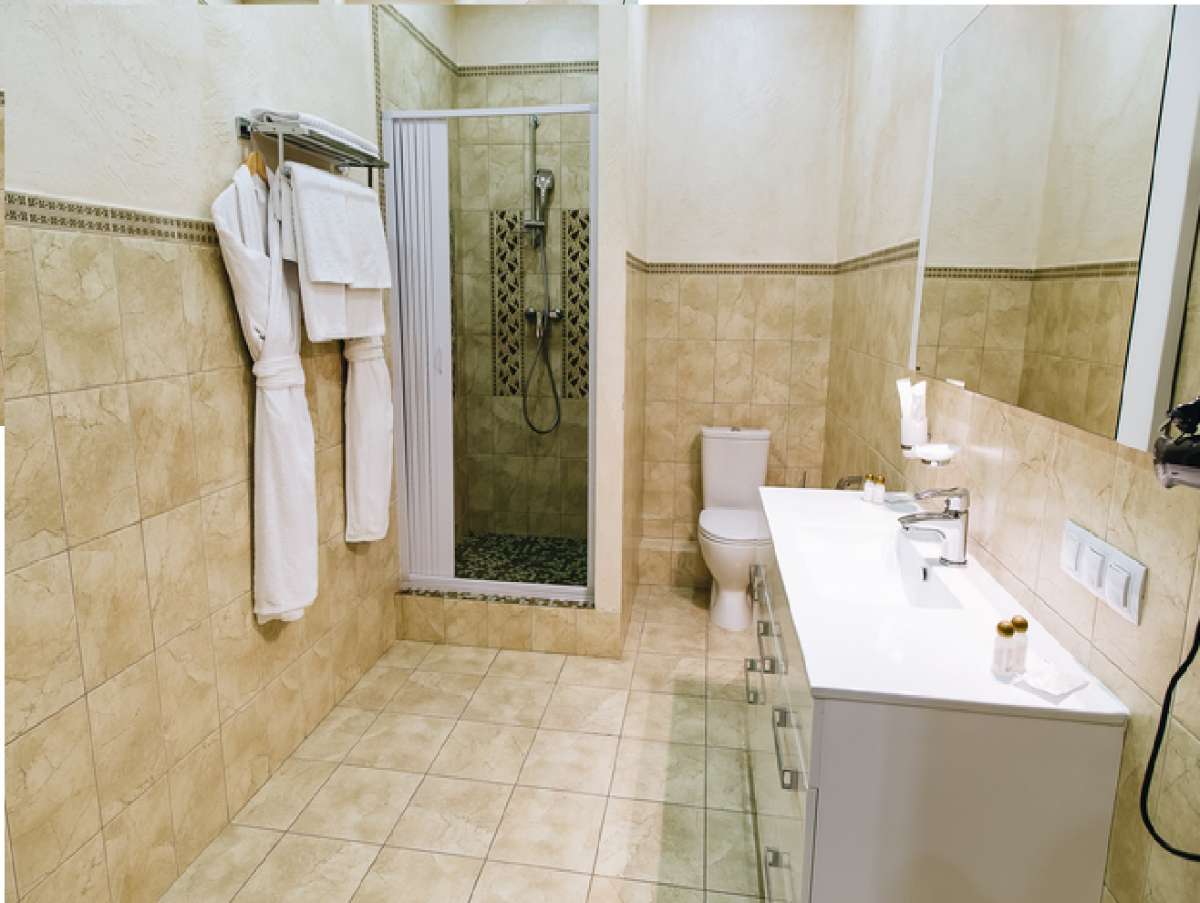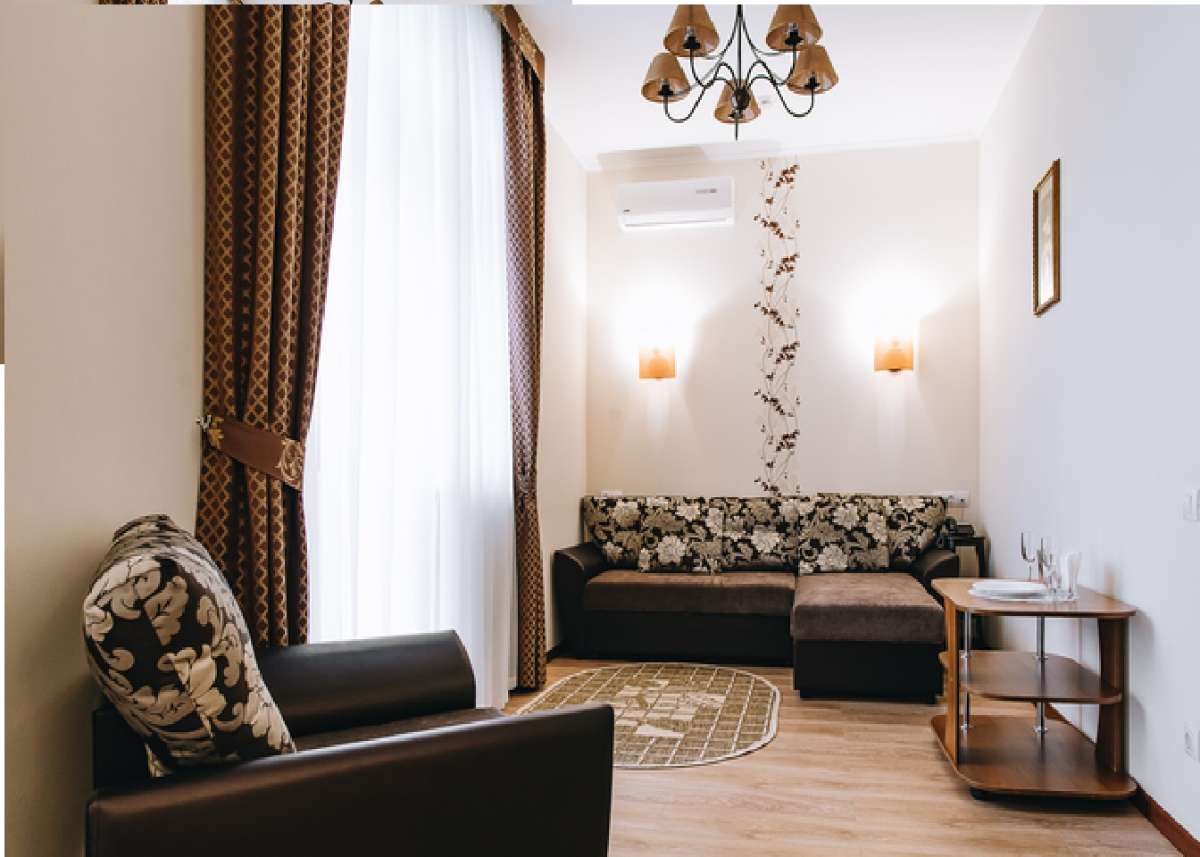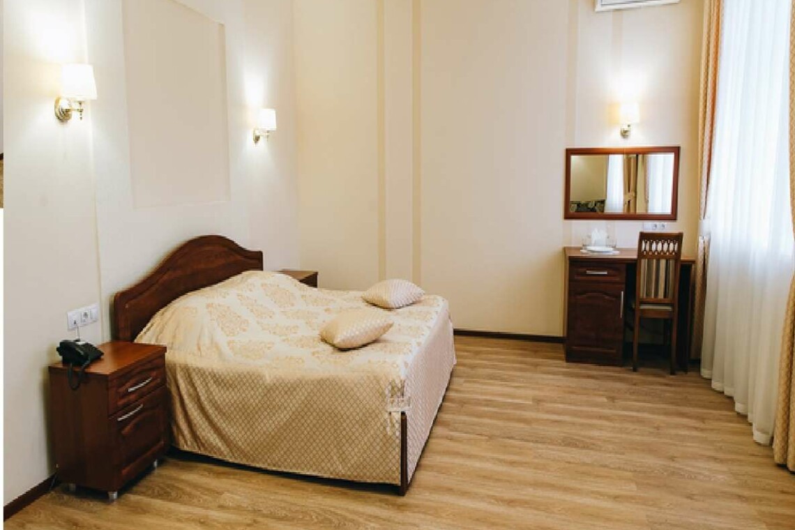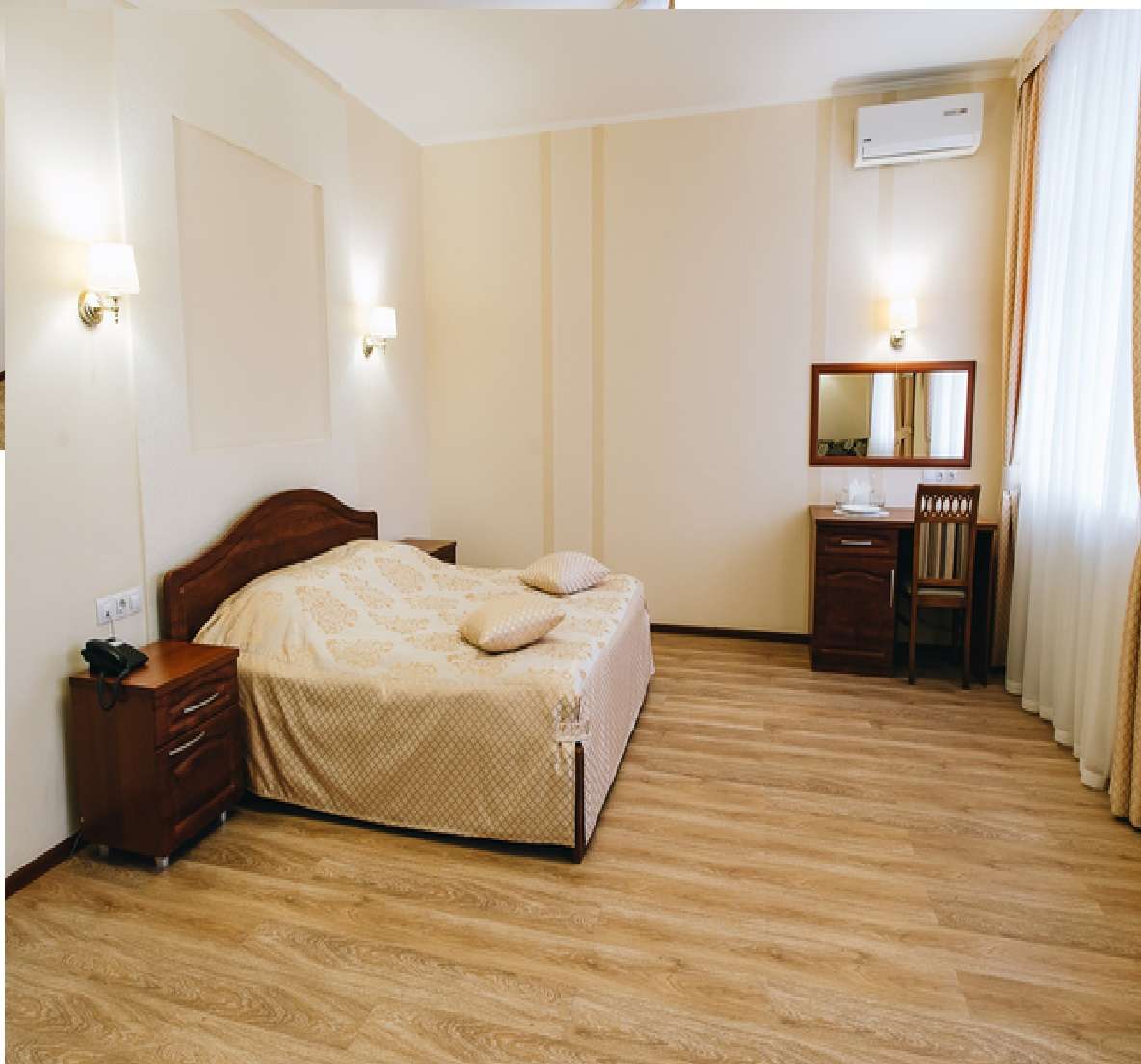 В каждом номере: • 1 двуспальная кровать либо 2 полуторки; • 2 прикроватные тумбочки; • шкаф-купе; • письменный стол и стул; • журнальный столик; • холодильник; • кондиционер; • телевизор; • сейф; • фен; • тапочки, полотенца, косметика.