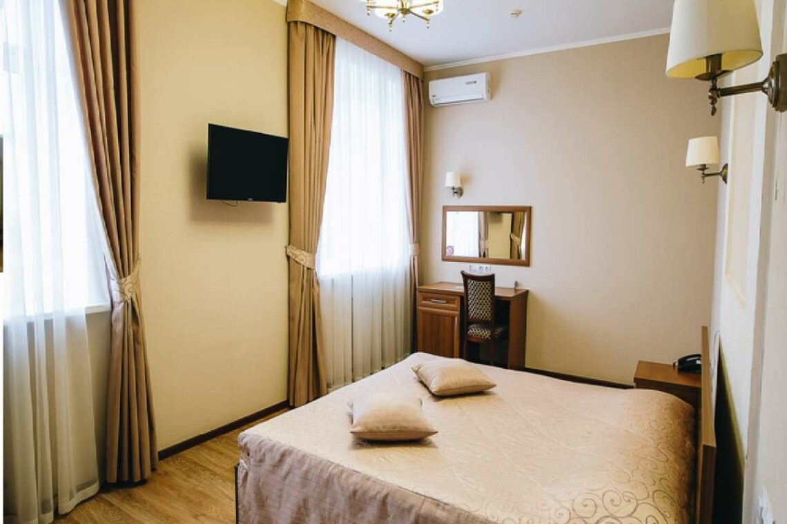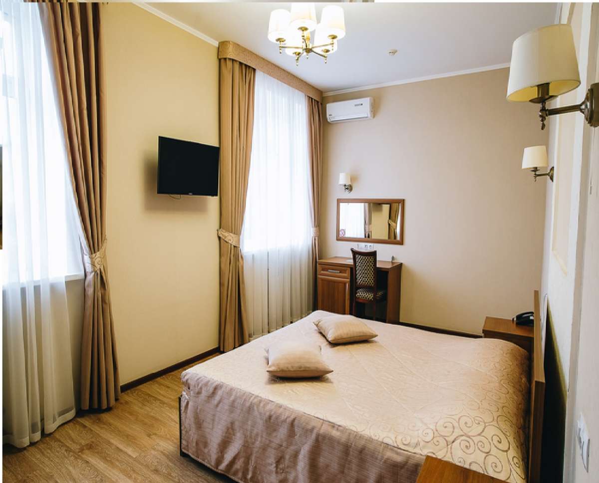 В каждом номере: • 1 двуспальная кровать либо 2 полуторки; • 2 прикроватные тумбочки; • шкаф-купе; • письменный стол и стул; • журнальный столик; • холодильник; • кондиционер; • телевизор; • сейф; • фен; • тапочки, полотенца, косметика.