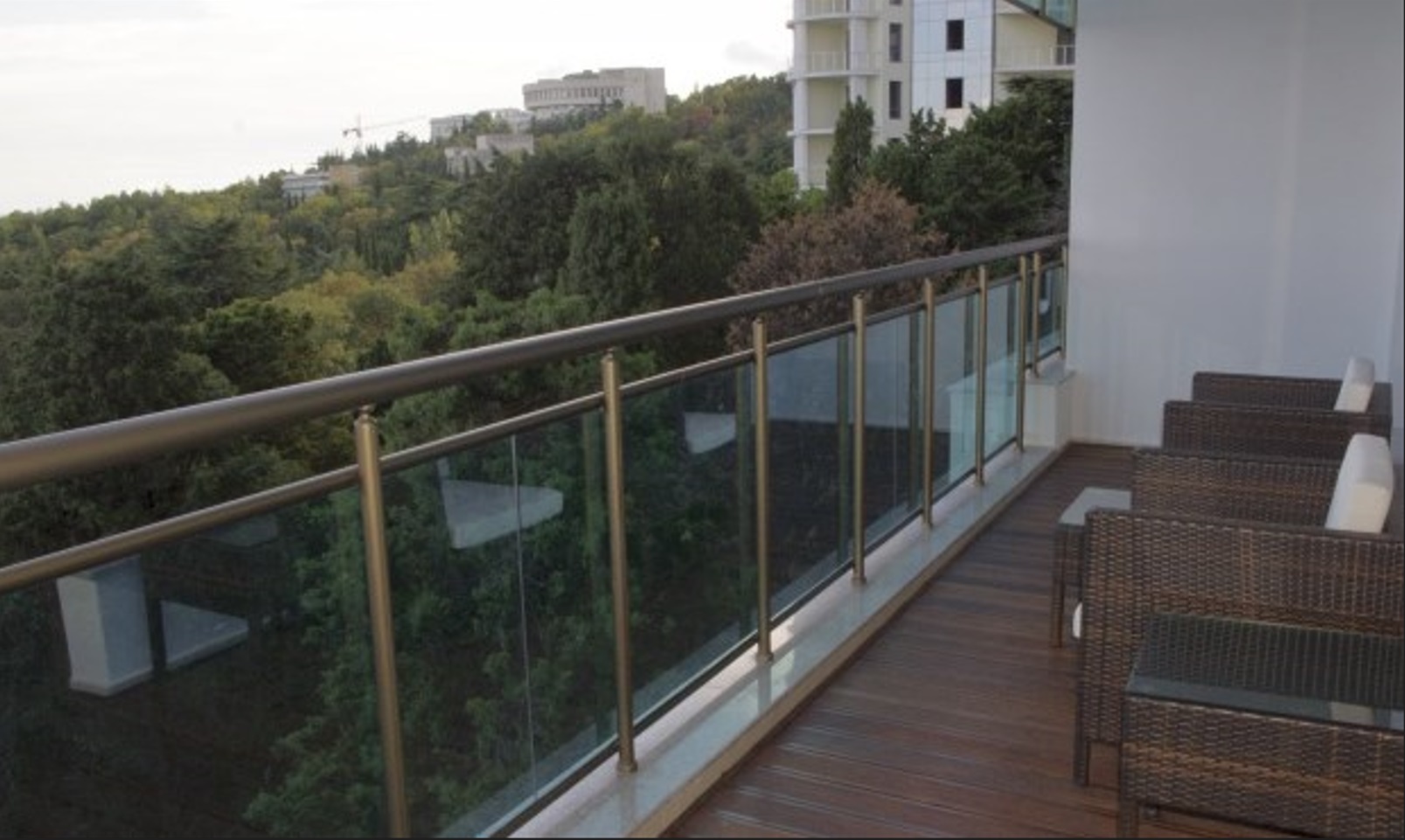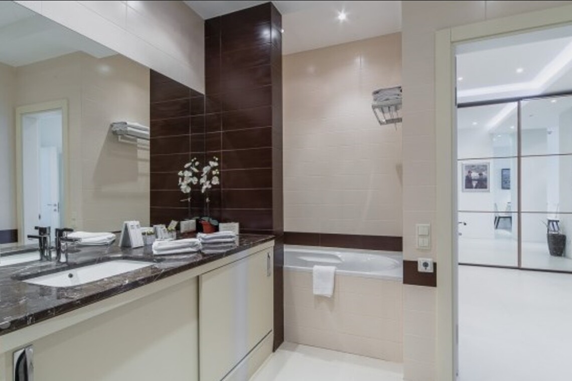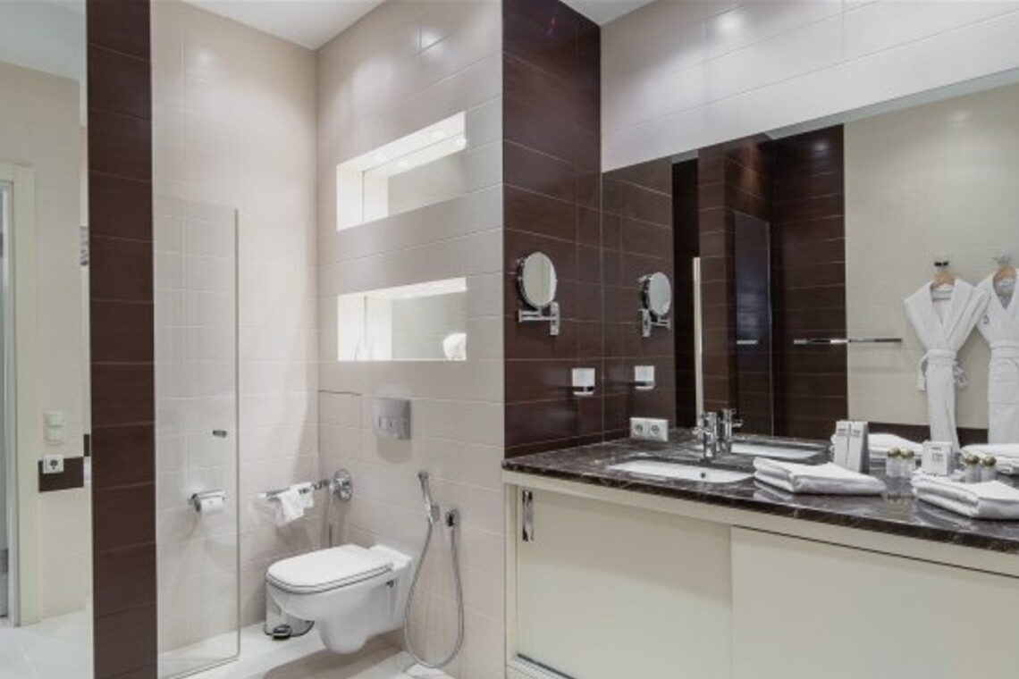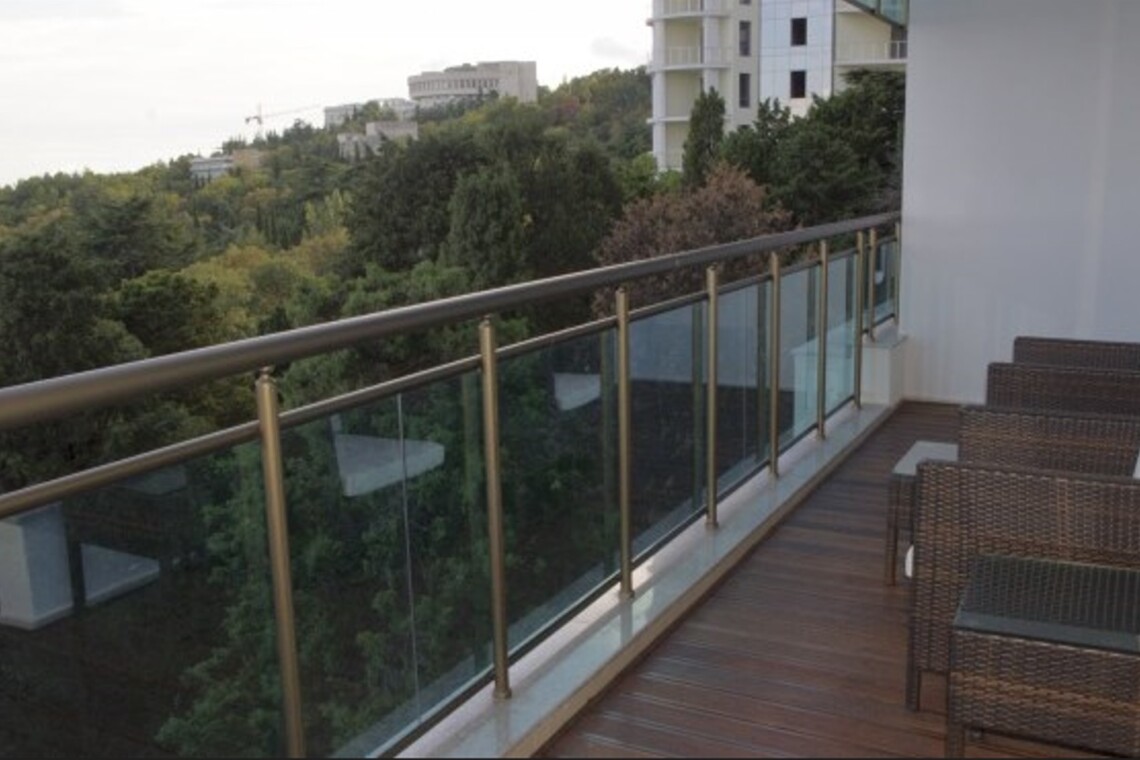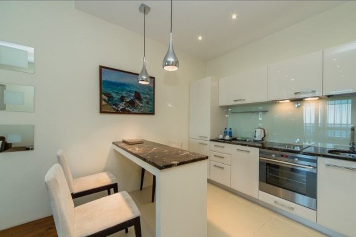Двухкомнатный апартамент с террасой. Интерьер в стиле «современный модерн» разработан студией интерьеров «Bell’Arte». В апартаментах итальянская мебель из натуральных материалов и предметы декора из Италии, а также картины известного крымского художника Баскова. Есть возможность размещения дополнительного места – раскладывающийся диван в гостиной. В апартаменте кухня с посудой, холодильник, посудомоечная машина, электроплита, телефон, большой плазменный телевизор, мини-бар, кондиционер. Работает Wi-Fi. Из гостиной и спальни имеется выход на террасу с плетеной мебелью и шикарной панорамой на море и Приморский парк.