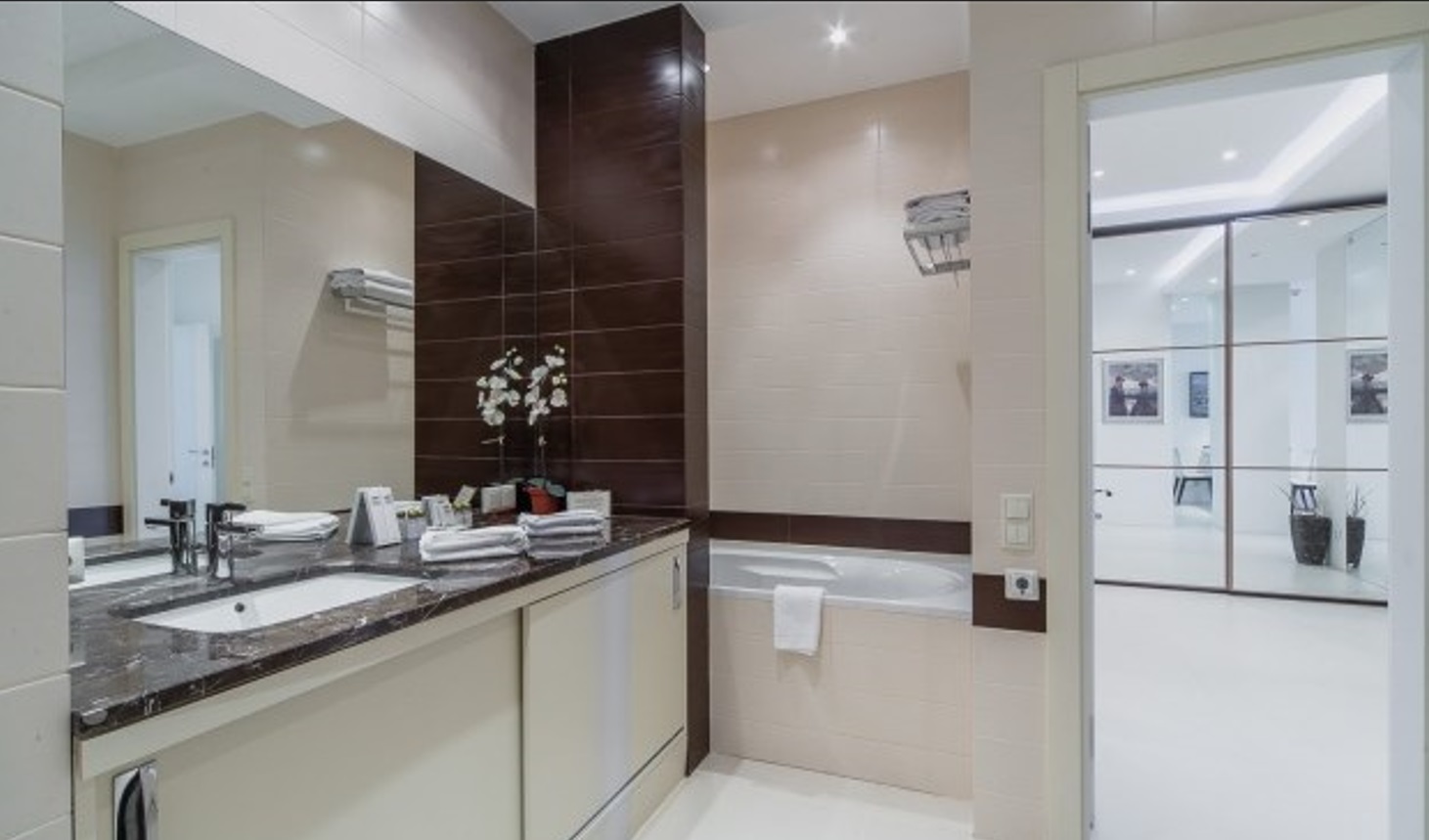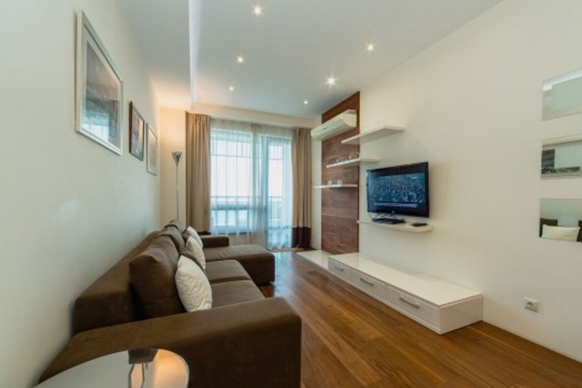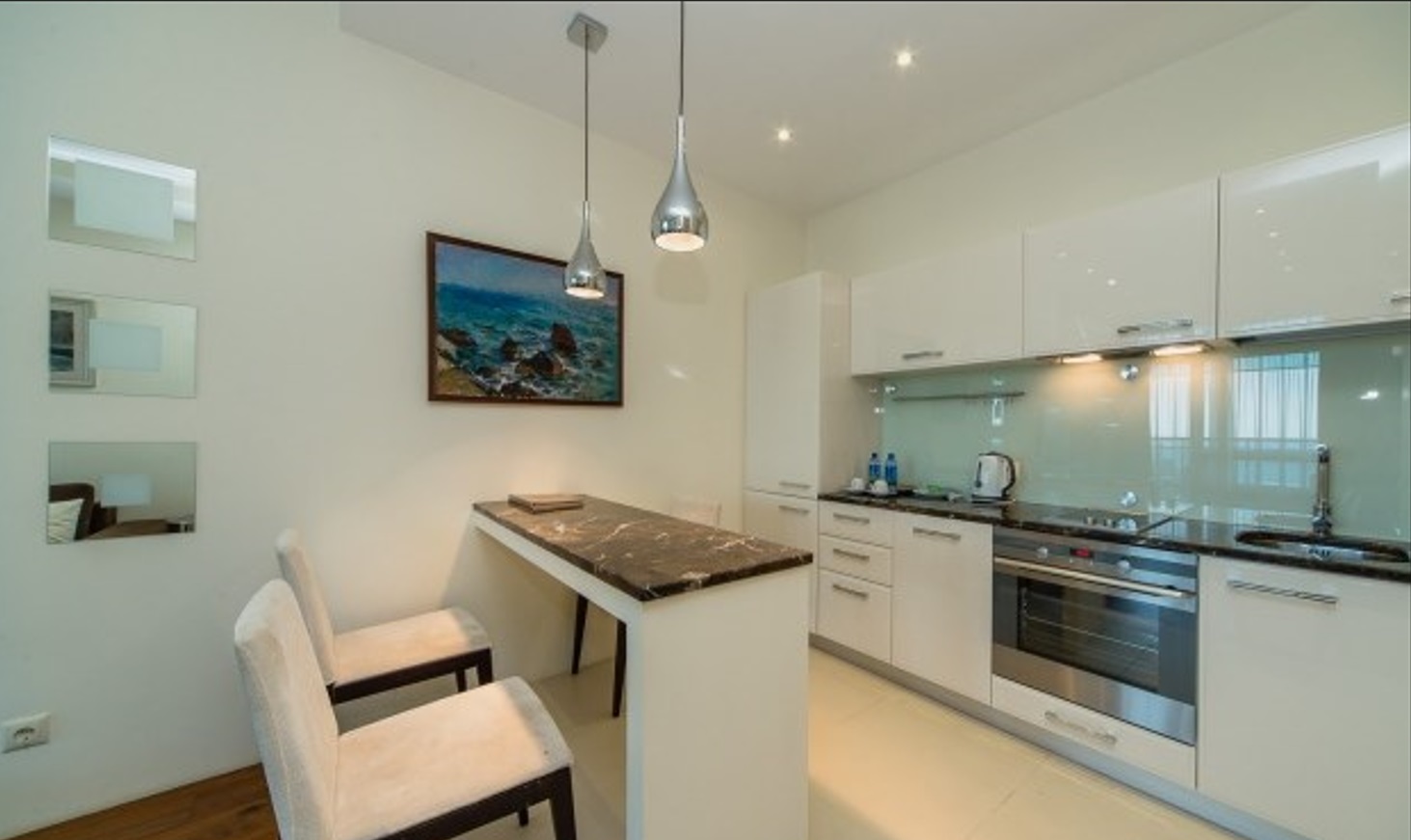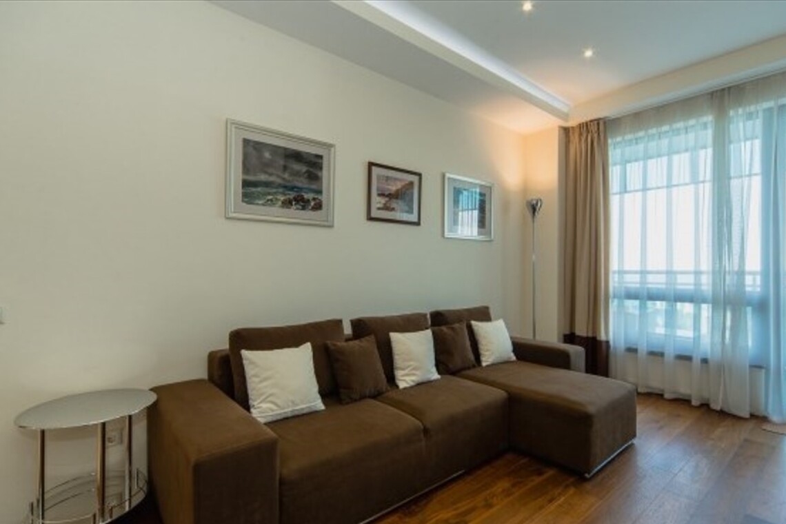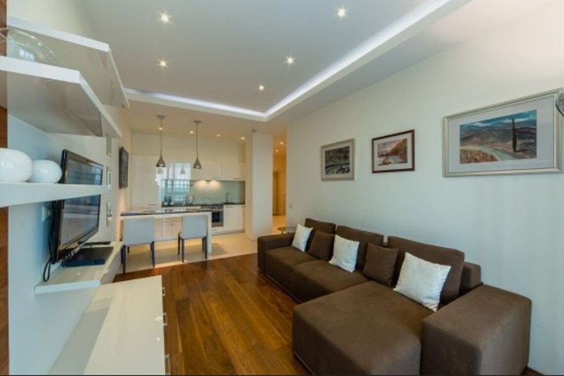 Двухкомнатный апартамент с террасой. Интерьер в стиле «современный модерн» разработан студией интерьеров «Bell’Arte». В апартаментах итальянская мебель из натуральных материалов и предметы декора из Италии, а также картины известного крымского художника Баскова. Есть возможность размещения дополнительного места – раскладывающийся диван в гостиной. В апартаменте кухня с посудой, холодильник, посудомоечная машина, электроплита, телефон, большой плазменный телевизор, мини-бар, кондиционер. Работает Wi-Fi. Из гостиной и спальни имеется выход на террасу с плетеной мебелью и шикарной панорамой на море и Приморский парк.