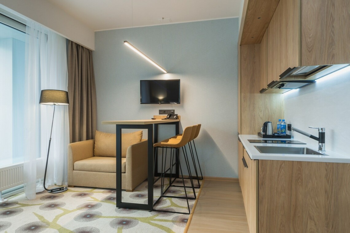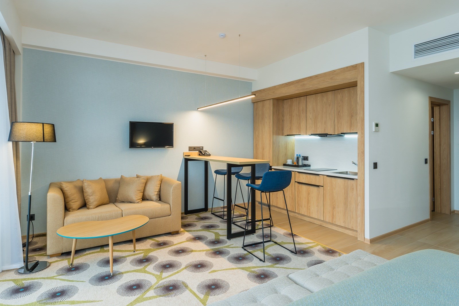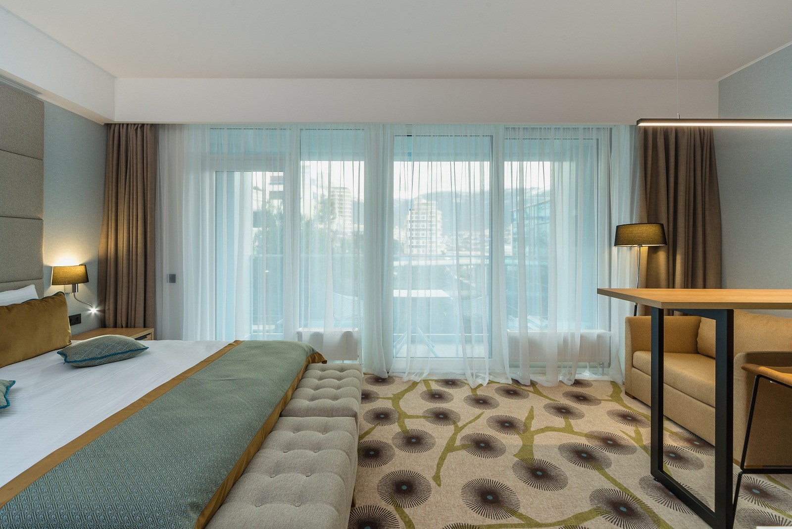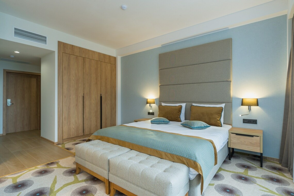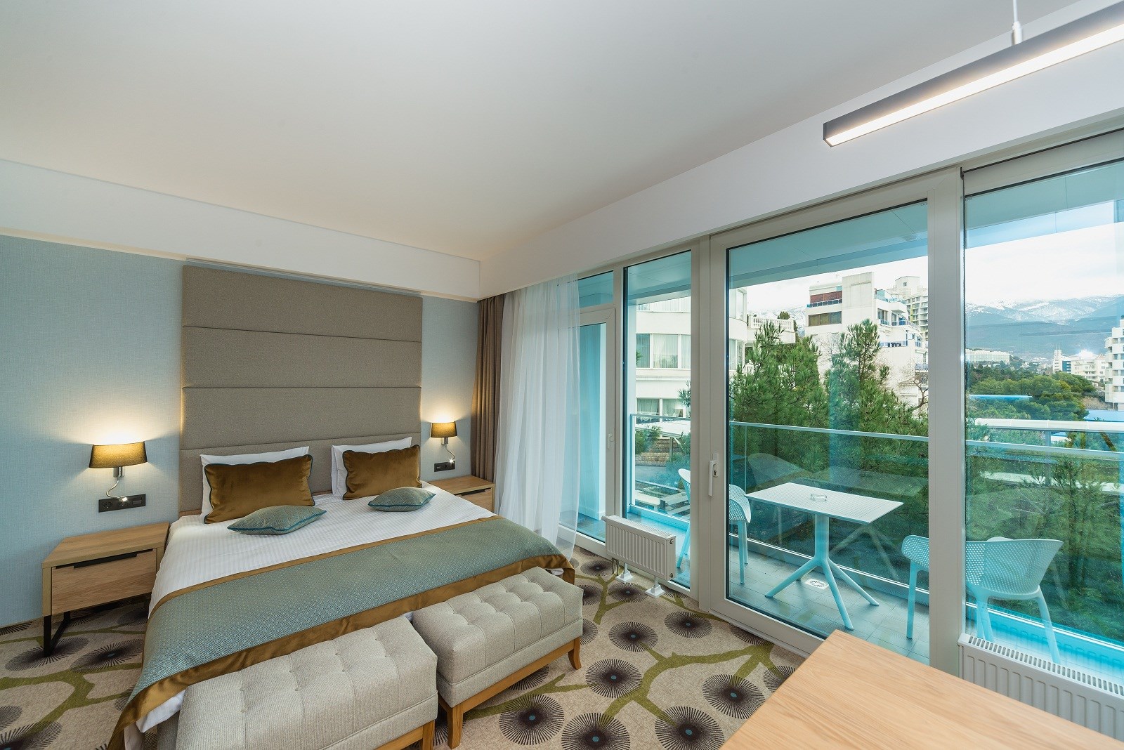 Однокомнатный номер 30 кв.м с 1 двуспальной кроватью и раскладным креслом, оснащенный мини-кухней. Новый корпус отеля на первой береговой линии.