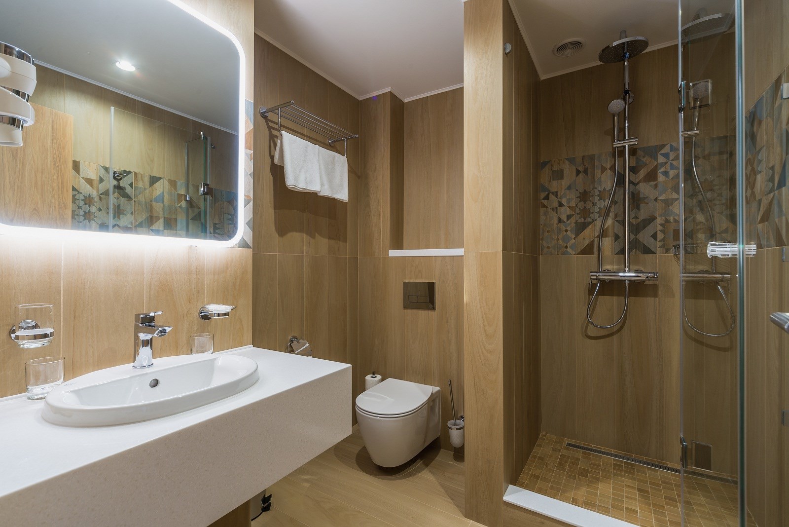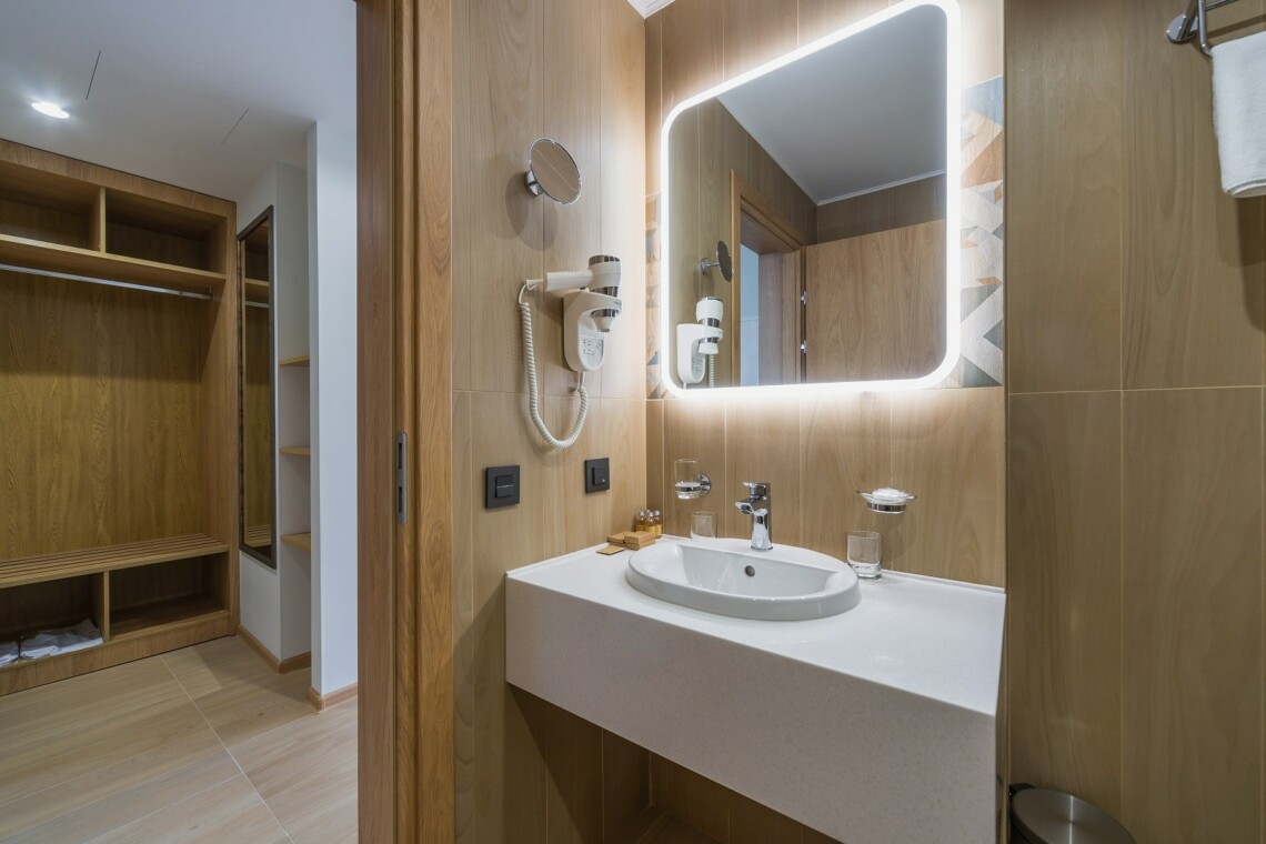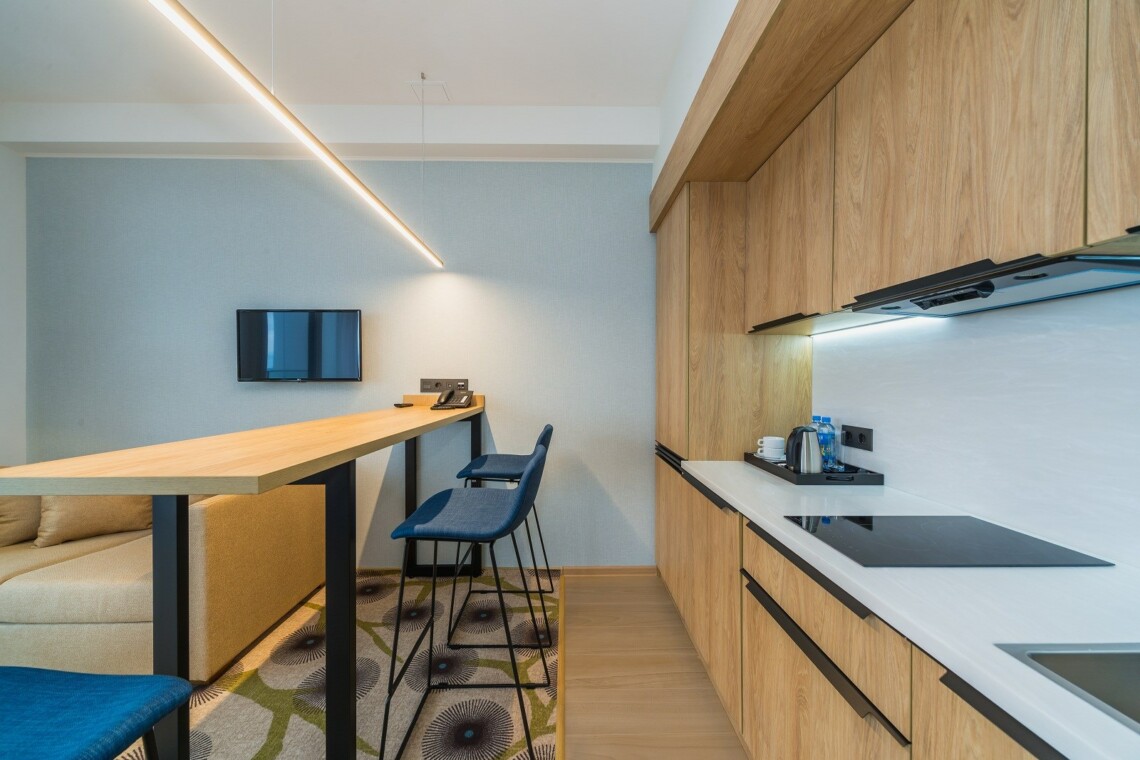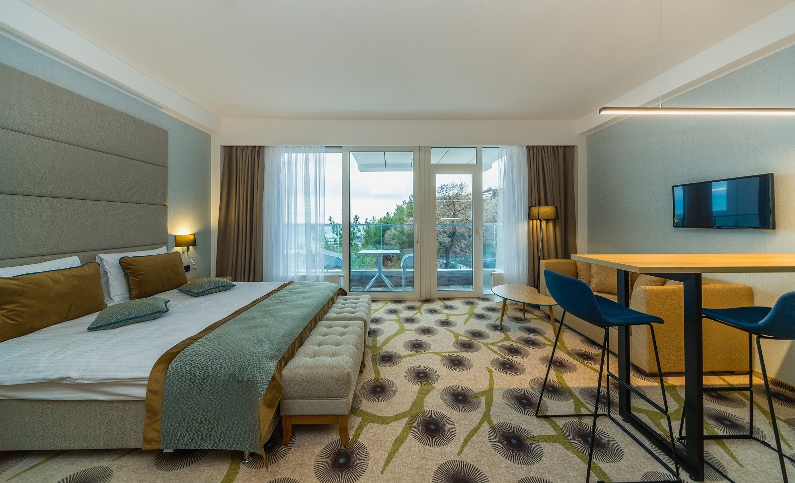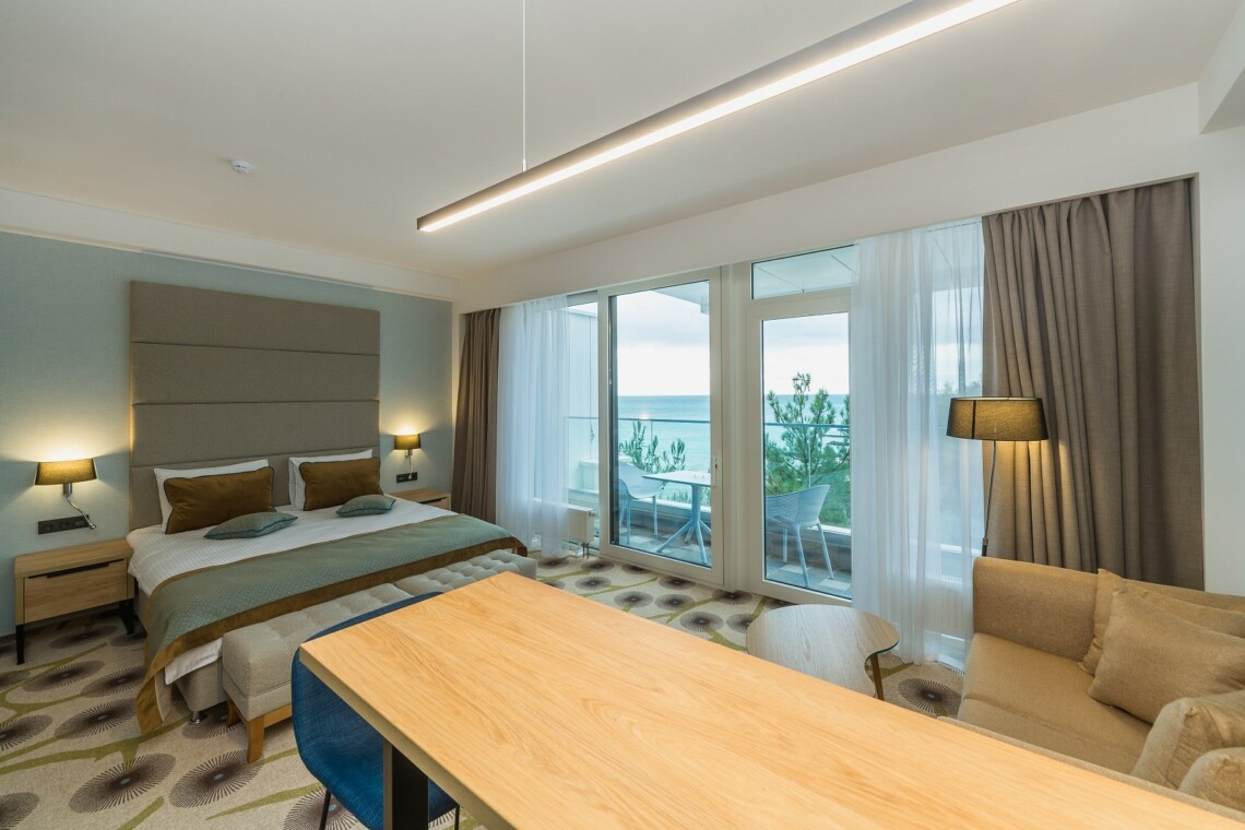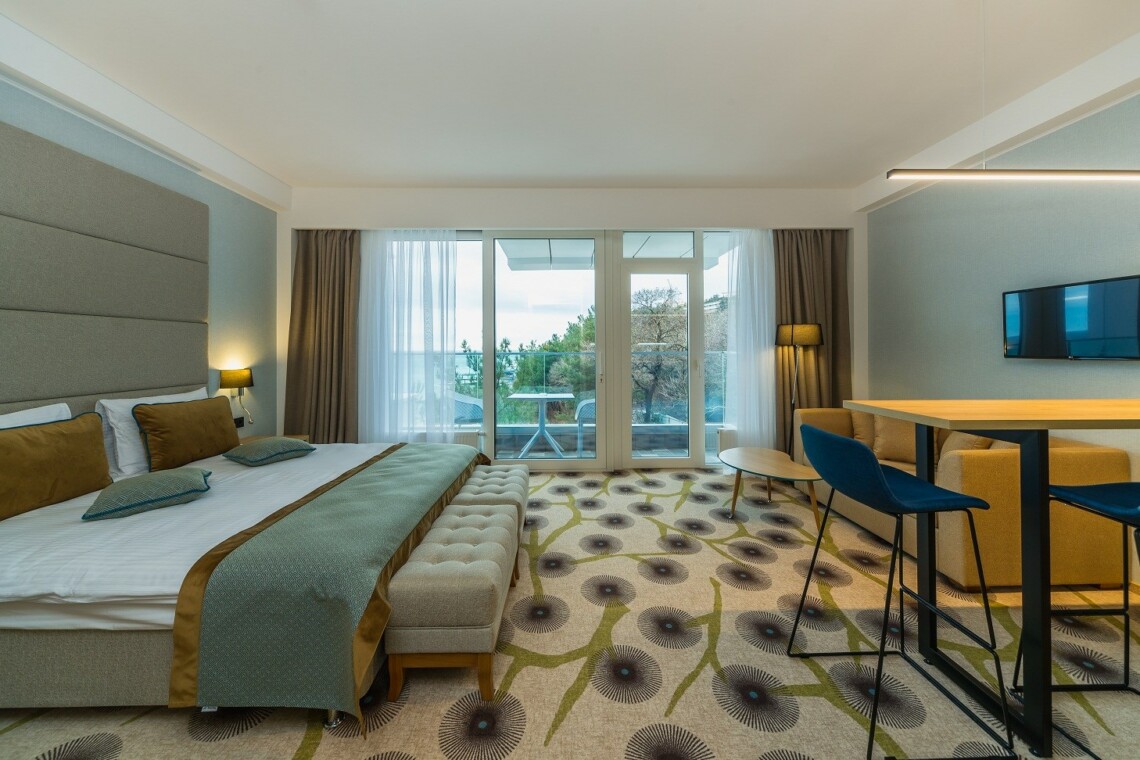 Однокомнатный номер 30 кв.м с 1 двуспальной кроватью и раскладным креслом, оснащенный мини-кухней. Новый корпус отеля на первой береговой линии.