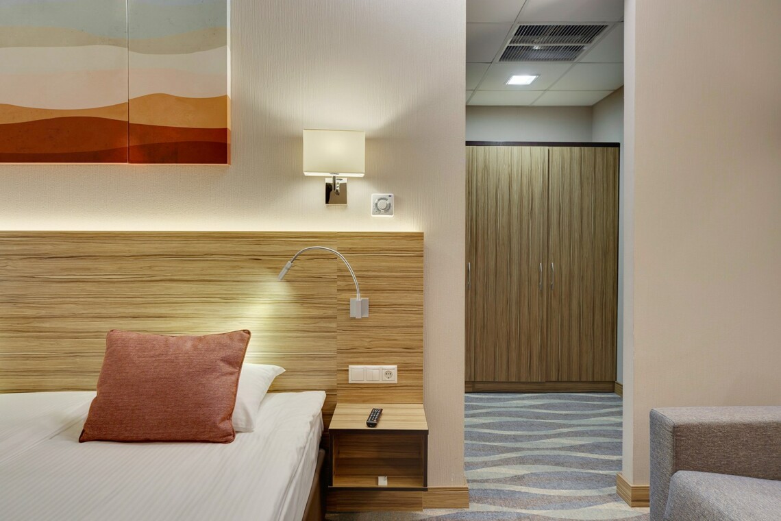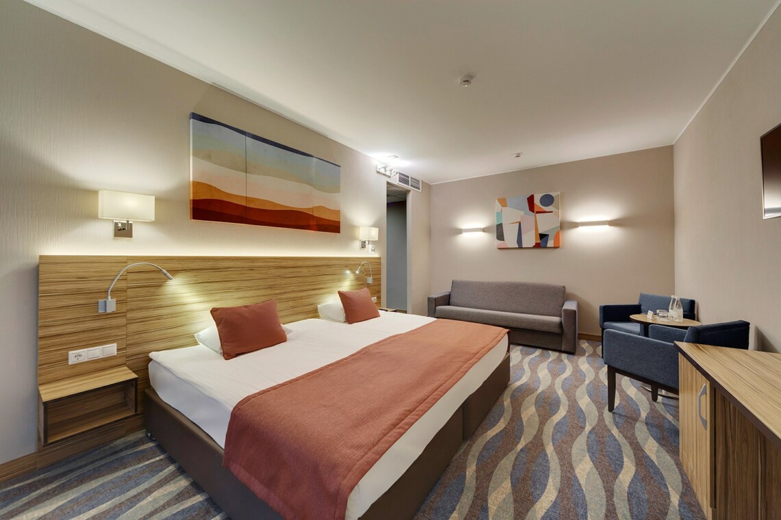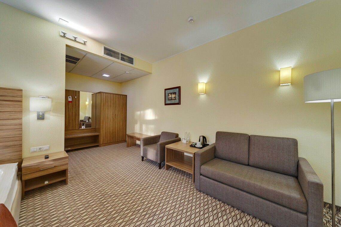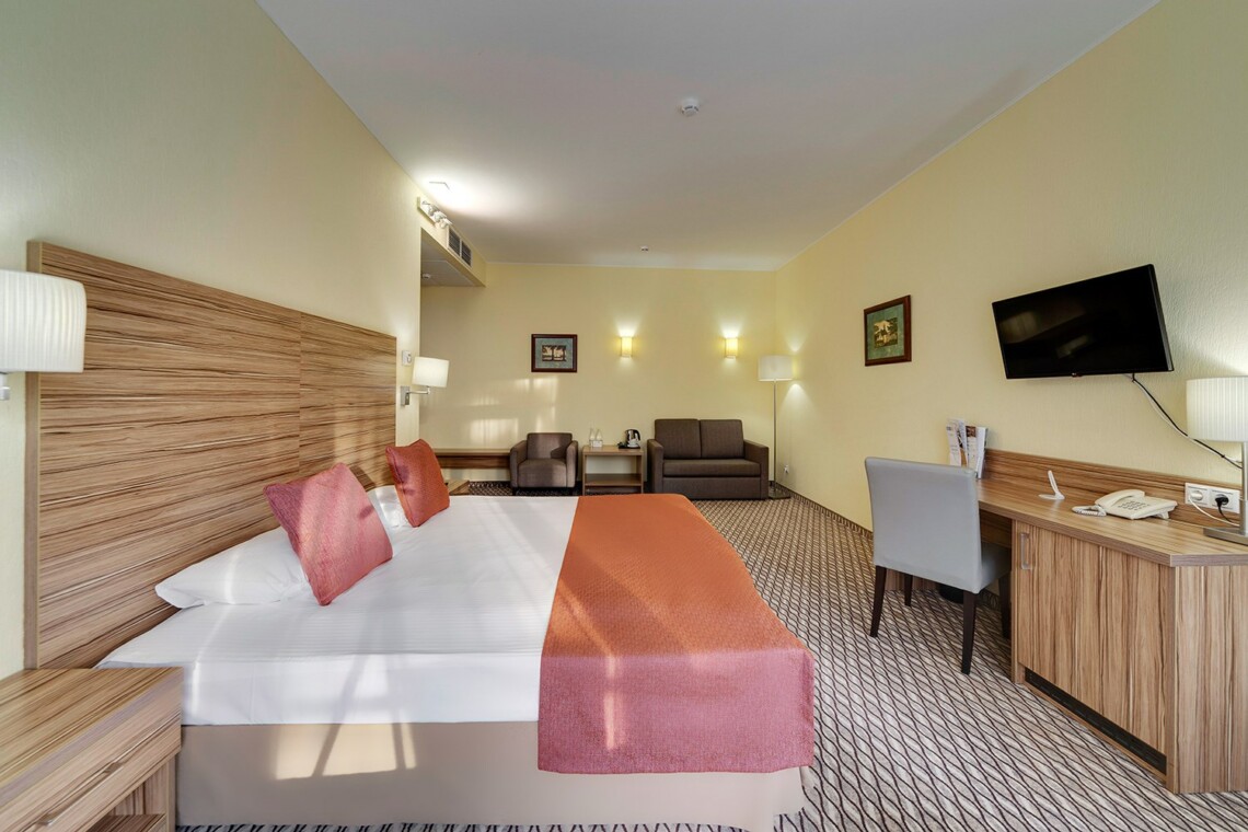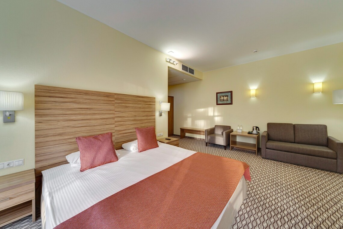 Просторные двухкомнатные номера категории «Люкс Супериор» оформлены в современном стиле, разделены на гостиную и спальню. Располагают к комфортному отдыху, идеально подходят для семейного отдыха или путешествия в компании. Питание включено в зависимости от выбранного тарифа. В отеле существует 2 варианта планировки номера «Люкс Супериор»:* В первом варианте номера «Люкс Супериор» две односпальные кровати, рабочее место, телевизор, журнальный столик, раскладывающийся угловой диван, кресла, барная стойка и стулья, электрический чайник и чайный набор, капсульная кофемашина Lavazza (при заезде предоставляются 2 капсулы), шкаф для одежды, багажная тумба, сейф, телефон и термоэлектрический мини холодильник (средняя температура 8°C). В ванной комнате ванная, фен, набор полотенец, косметические принадлежности (зубной набор по запросу), халаты и тапочки. В гостиной отдельный санузел. Во втором варианте номера «Люкс Супериор», в спальне большая двуспальная кровать размера King size, туалетный столик, телевизор, телефон. В гостиной набор мягкой мебели из 2-х кресел и раскладывающегося дивана, журнальный столик, рабочее место, телевизор, телефон, термоэлектрический мини холодильник (средняя температура 8°C), сейф, электрический чайник и чайный набор, капсульная кофемашина Lavazza (при заезде предоставляются 2 капсулы). В ванной комнате ванная, фен, набор полотенец, косметические принадлежности (зубной набор по запросу), халаты и тапочки. В гостиной отдельный санузел. На каждого гостя на весь период проживания комплементарно предоставляется бутылка воды 0,5 без газа. За дополнительную плату можно заказать “Мини-бар сет”.