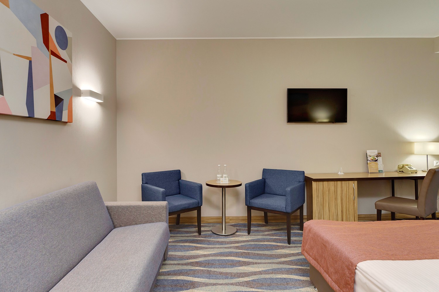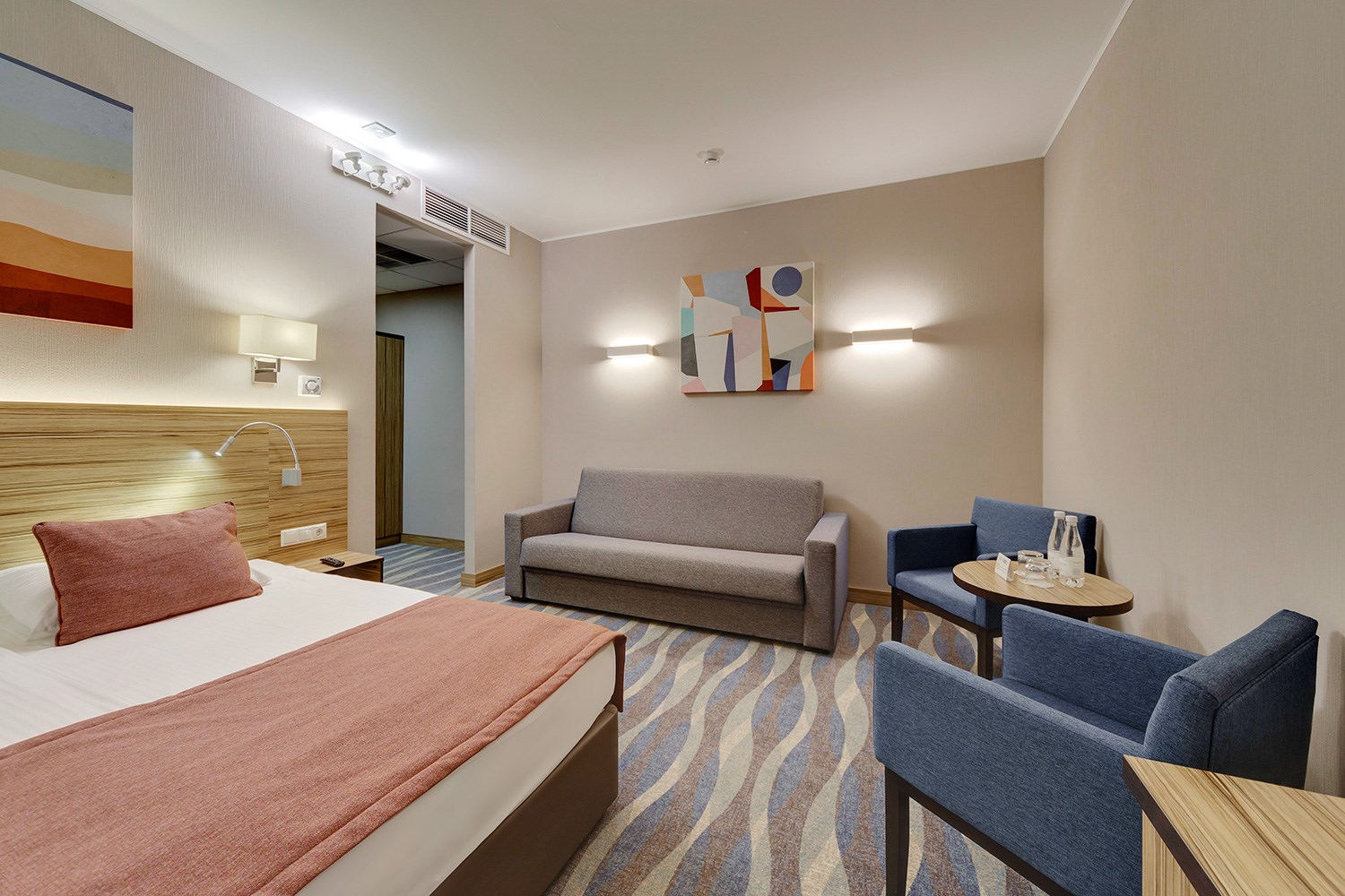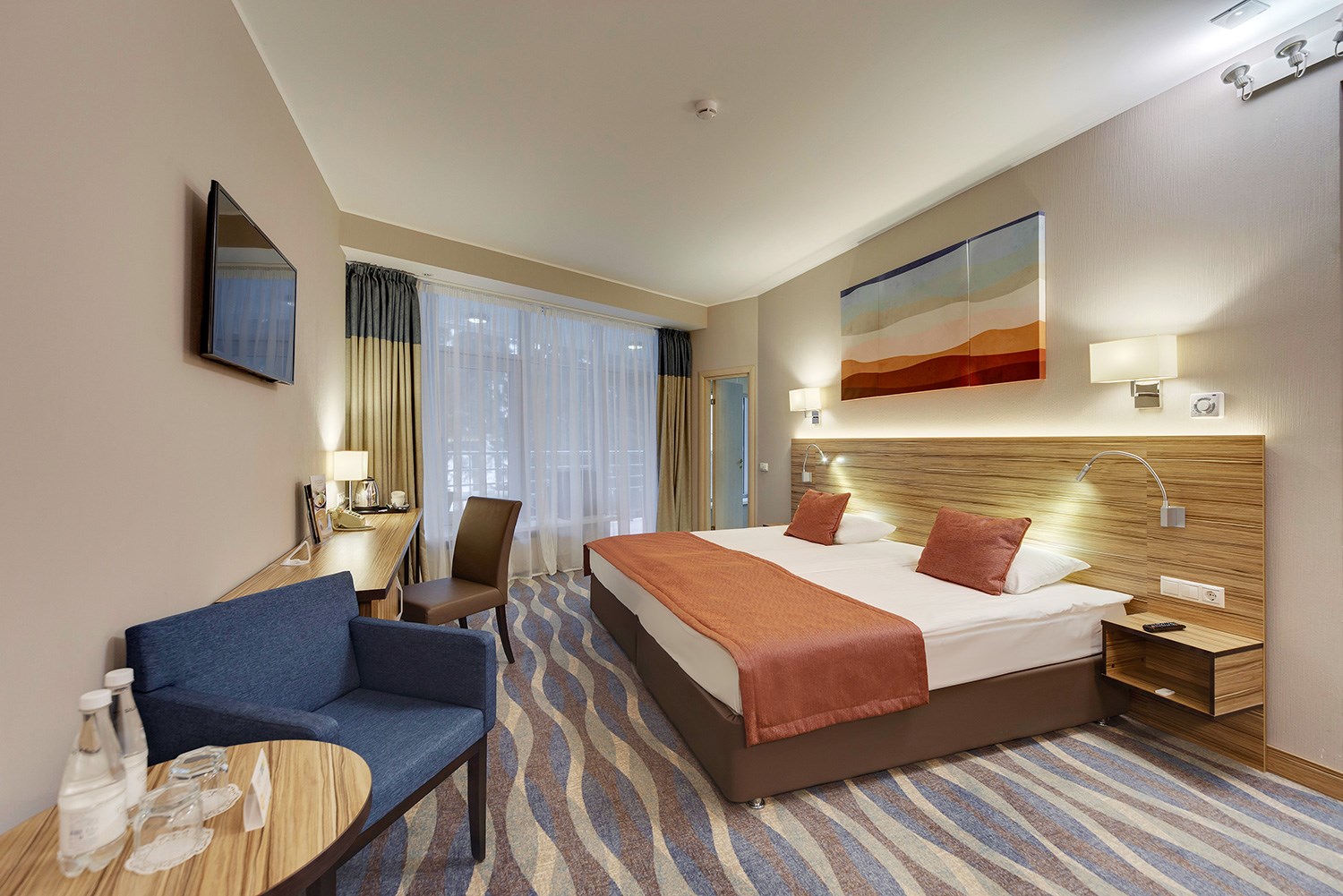 Просторные двухкомнатные номера категории «Люкс Супериор» оформлены в современном стиле, разделены на гостиную и спальню. Располагают к комфортному отдыху, идеально подходят для семейного отдыха или путешествия в компании. Питание включено в зависимости от выбранного тарифа. В отеле существует 2 варианта планировки номера «Люкс Супериор»:* В первом варианте номера «Люкс Супериор» две односпальные кровати, рабочее место, телевизор, журнальный столик, раскладывающийся угловой диван, кресла, барная стойка и стулья, электрический чайник и чайный набор, капсульная кофемашина Lavazza (при заезде предоставляются 2 капсулы), шкаф для одежды, багажная тумба, сейф, телефон и термоэлектрический мини холодильник (средняя температура 8°C). В ванной комнате ванная, фен, набор полотенец, косметические принадлежности (зубной набор по запросу), халаты и тапочки. В гостиной отдельный санузел. Во втором варианте номера «Люкс Супериор», в спальне большая двуспальная кровать размера King size, туалетный столик, телевизор, телефон. В гостиной набор мягкой мебели из 2-х кресел и раскладывающегося дивана, журнальный столик, рабочее место, телевизор, телефон, термоэлектрический мини холодильник (средняя температура 8°C), сейф, электрический чайник и чайный набор, капсульная кофемашина Lavazza (при заезде предоставляются 2 капсулы). В ванной комнате ванная, фен, набор полотенец, косметические принадлежности (зубной набор по запросу), халаты и тапочки. В гостиной отдельный санузел. На каждого гостя на весь период проживания комплементарно предоставляется бутылка воды 0,5 без газа. За дополнительную плату можно заказать “Мини-бар сет”.