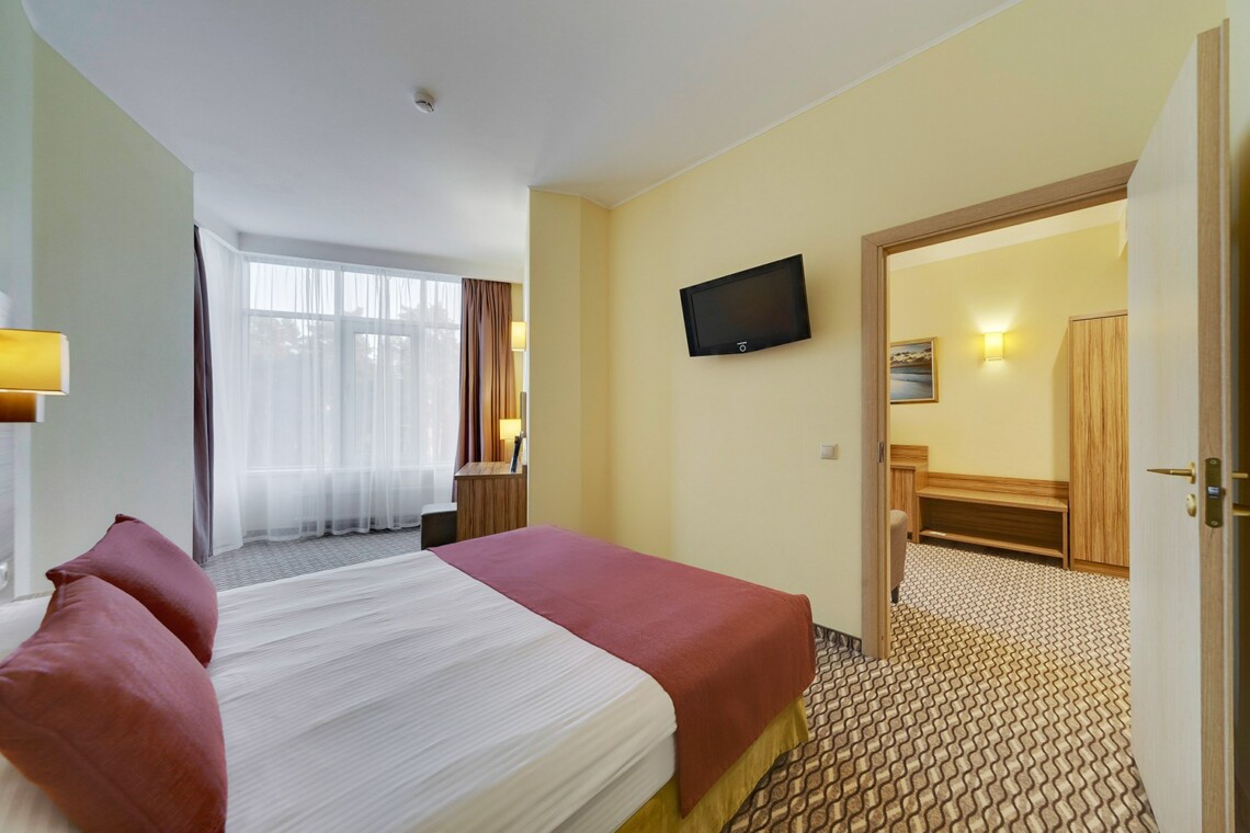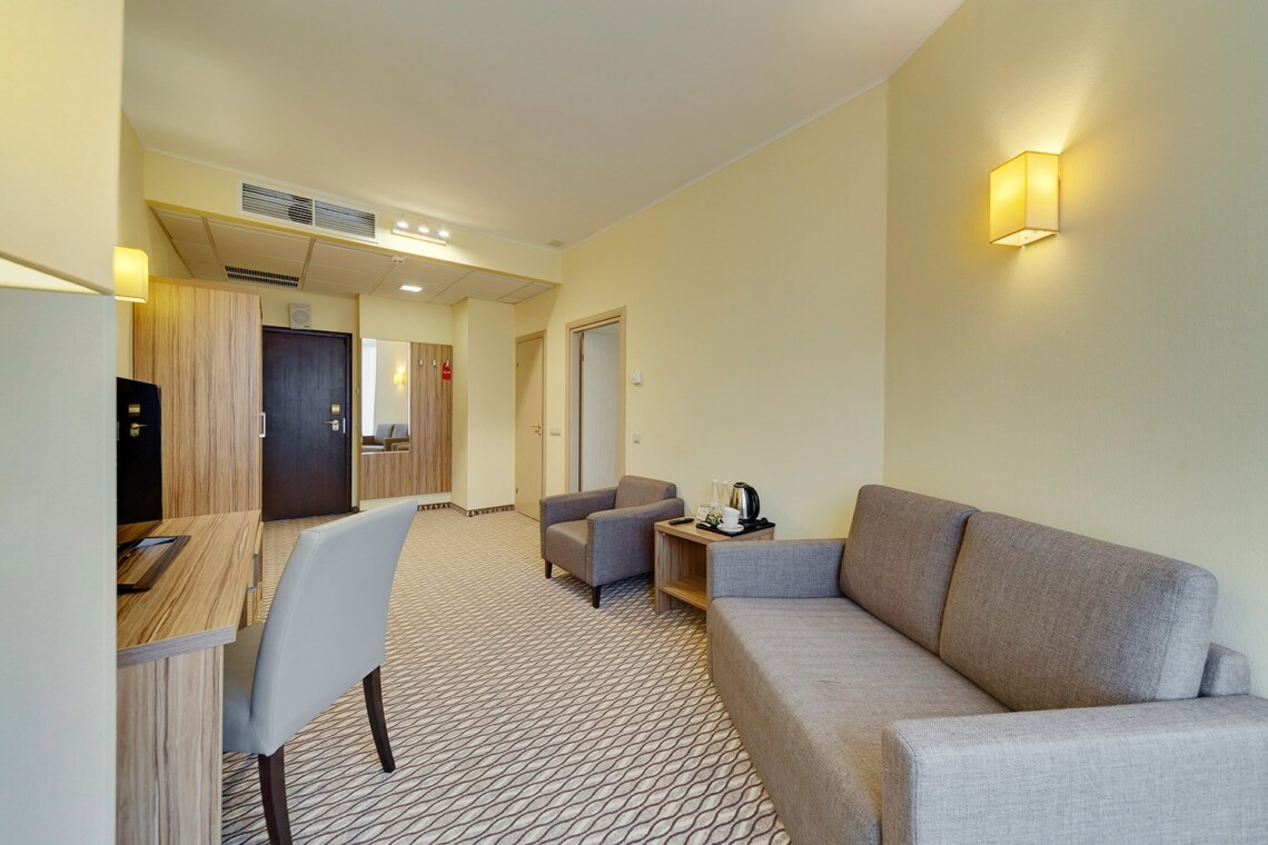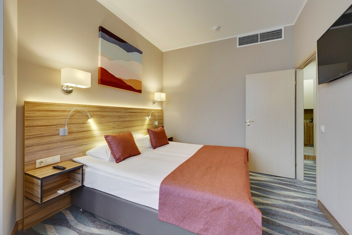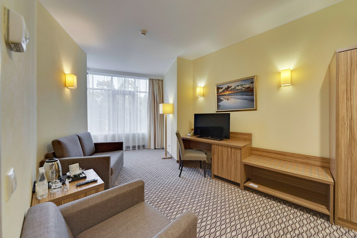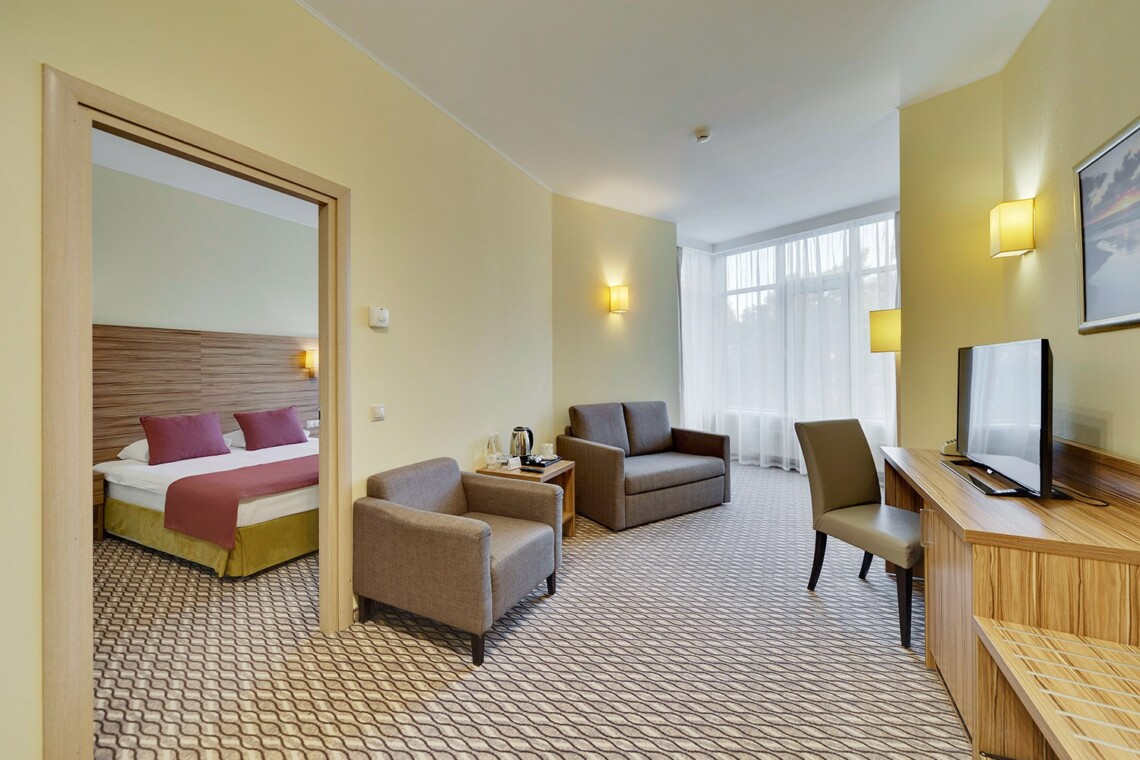 Просторные двухкомнатные номера категории «Люкс» оформлены в современном стиле, разделены на гостиную и спальню. Располагают к комфортному отдыху, идеально подходят для семейного отдыха или путешествия в компании. Питание включено в зависимости от выбранного тарифа. В отеле существует 2 варианта планировки номера «Люкс»:* В первом варианте номера «Люкс» две односпальные кровати, рабочее место, телевизор, журнальный столик, кресло, раскладной диван, электрический чайник и чайный набор, шкаф для одежды, багажная тумба, сейф, телефон и термоэлектрический мини холодильник (средняя температура 8°C). В ванной комнате: душевая кабина, фен, набор полотенец, косметические принадлежности (зубной набор по запросу), халаты и тапочки. Во втором варианте номера «Люкс» двуспальная кровать, прикроватные тумбы, рабочее место, раскладывающийся диван, телевизор, телефон, журнальный столик, кресло-кровать, электрический чайник и чайный набор, шкаф для одежды, багажная тумба, сейф, телефон и термоэлектрический мини холодильник (средняя температура 8°C). В ванной комнате: душевая кабина, фен, набор полотенец, косметические принадлежности (зубной набор по запросу), халаты и тапочки. На каждого гостя на весь период проживания комплементарно предоставляется бутылка воды 0,5 без газа. За дополнительную плату можно заказать “Мини-бар сет”.