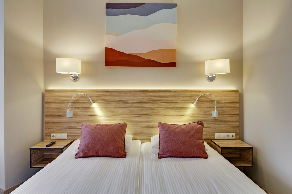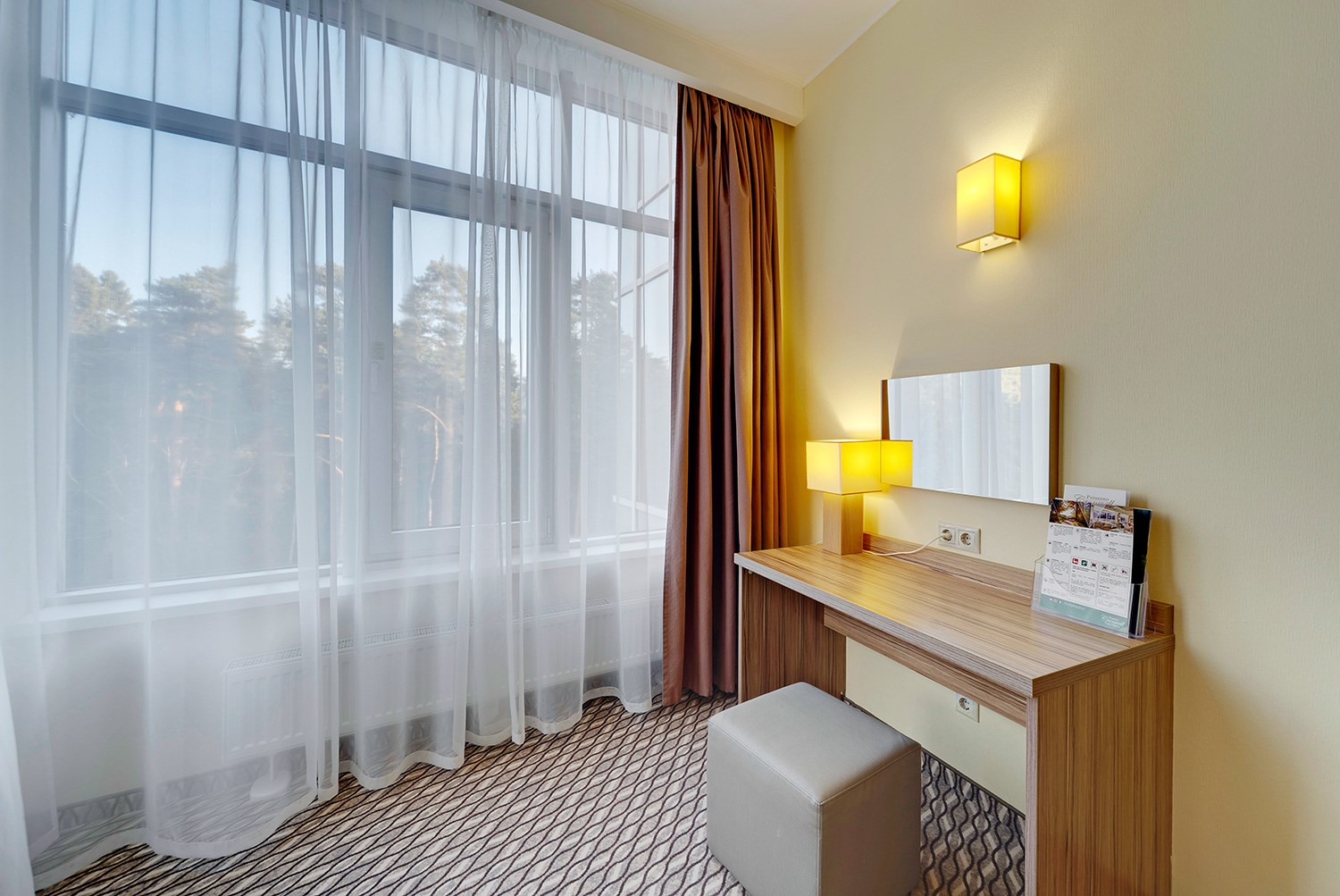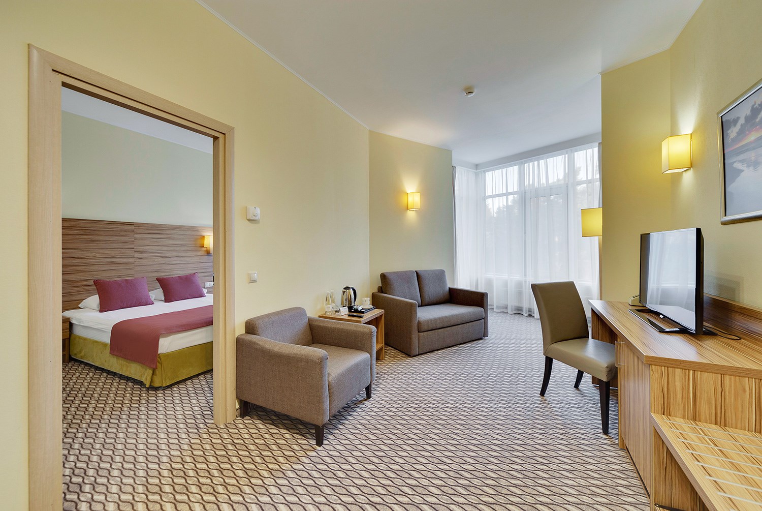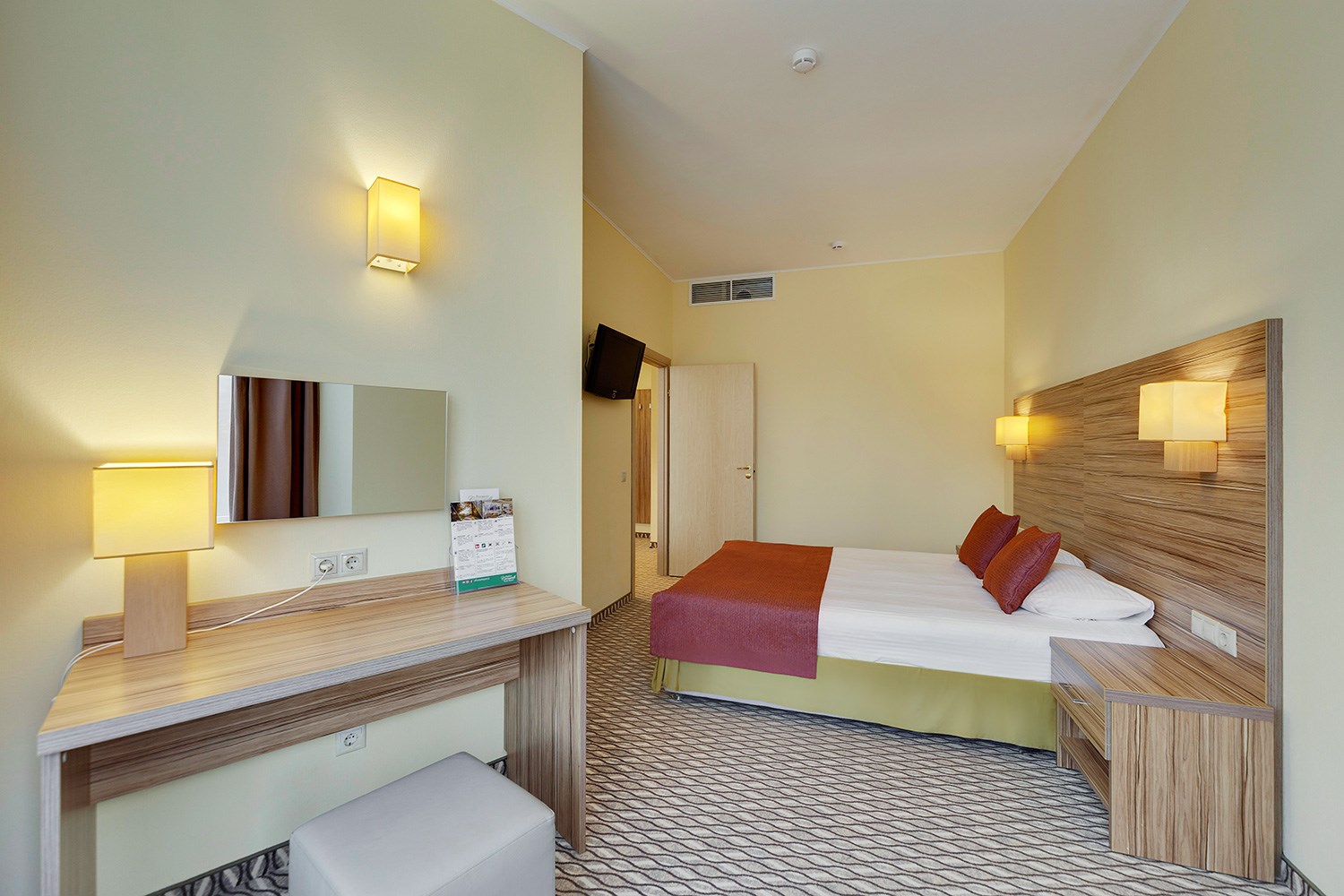 Просторные двухкомнатные номера категории «Люкс» оформлены в современном стиле, разделены на гостиную и спальню. Располагают к комфортному отдыху, идеально подходят для семейного отдыха или путешествия в компании. Питание включено в зависимости от выбранного тарифа. В отеле существует 2 варианта планировки номера «Люкс»:* В первом варианте номера «Люкс» две односпальные кровати, рабочее место, телевизор, журнальный столик, кресло, раскладной диван, электрический чайник и чайный набор, шкаф для одежды, багажная тумба, сейф, телефон и термоэлектрический мини холодильник (средняя температура 8°C). В ванной комнате: душевая кабина, фен, набор полотенец, косметические принадлежности (зубной набор по запросу), халаты и тапочки. Во втором варианте номера «Люкс» двуспальная кровать, прикроватные тумбы, рабочее место, раскладывающийся диван, телевизор, телефон, журнальный столик, кресло-кровать, электрический чайник и чайный набор, шкаф для одежды, багажная тумба, сейф, телефон и термоэлектрический мини холодильник (средняя температура 8°C). В ванной комнате: душевая кабина, фен, набор полотенец, косметические принадлежности (зубной набор по запросу), халаты и тапочки. На каждого гостя на весь период проживания комплементарно предоставляется бутылка воды 0,5 без газа. За дополнительную плату можно заказать “Мини-бар сет”.
