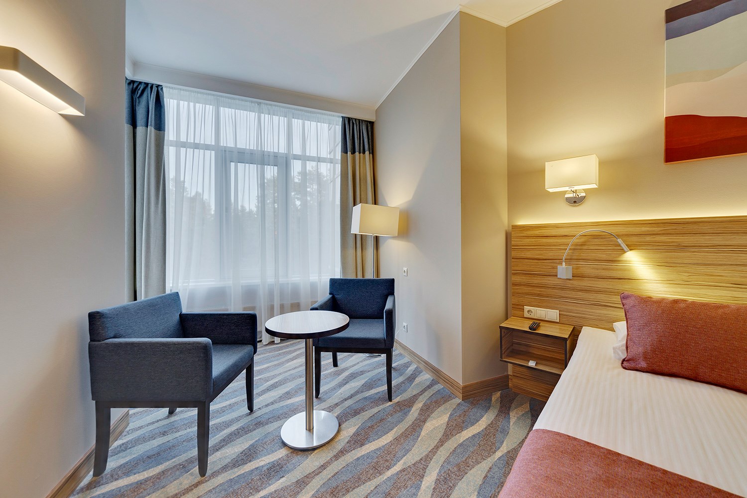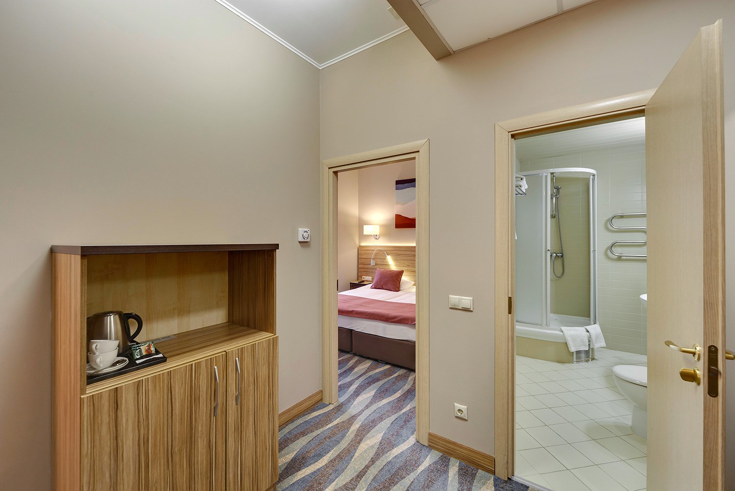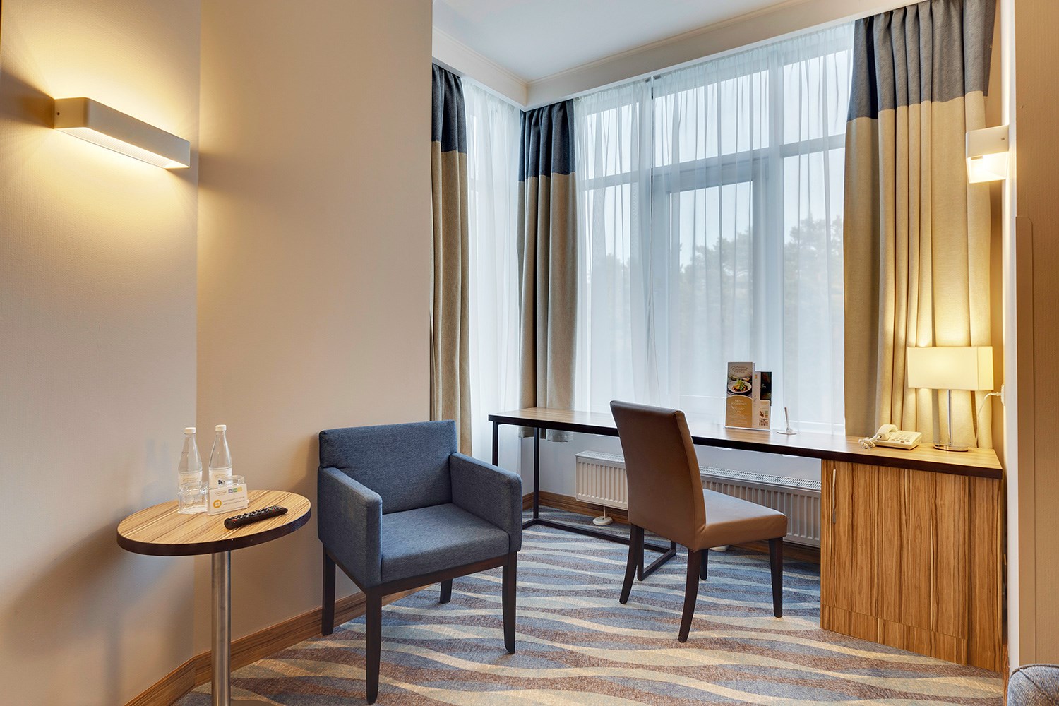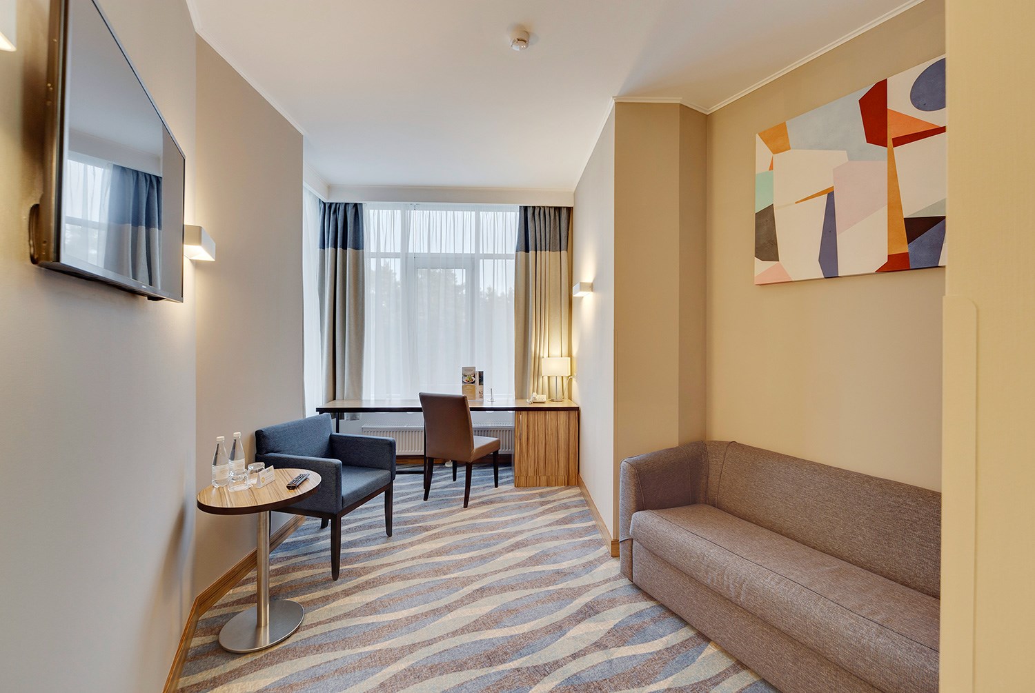 Просторные двухкомнатные номера категории «Люкс» оформлены в современном стиле, разделены на гостиную и спальню. Располагают к комфортному отдыху, идеально подходят для семейного отдыха или путешествия в компании. Питание включено в зависимости от выбранного тарифа. В отеле существует 2 варианта планировки номера «Люкс»:* В первом варианте номера «Люкс» две односпальные кровати, рабочее место, телевизор, журнальный столик, кресло, раскладной диван, электрический чайник и чайный набор, шкаф для одежды, багажная тумба, сейф, телефон и термоэлектрический мини холодильник (средняя температура 8°C). В ванной комнате: душевая кабина, фен, набор полотенец, косметические принадлежности (зубной набор по запросу), халаты и тапочки. Во втором варианте номера «Люкс» двуспальная кровать, прикроватные тумбы, рабочее место, раскладывающийся диван, телевизор, телефон, журнальный столик, кресло-кровать, электрический чайник и чайный набор, шкаф для одежды, багажная тумба, сейф, телефон и термоэлектрический мини холодильник (средняя температура 8°C). В ванной комнате: душевая кабина, фен, набор полотенец, косметические принадлежности (зубной набор по запросу), халаты и тапочки. На каждого гостя на весь период проживания комплементарно предоставляется бутылка воды 0,5 без газа. За дополнительную плату можно заказать “Мини-бар сет”.