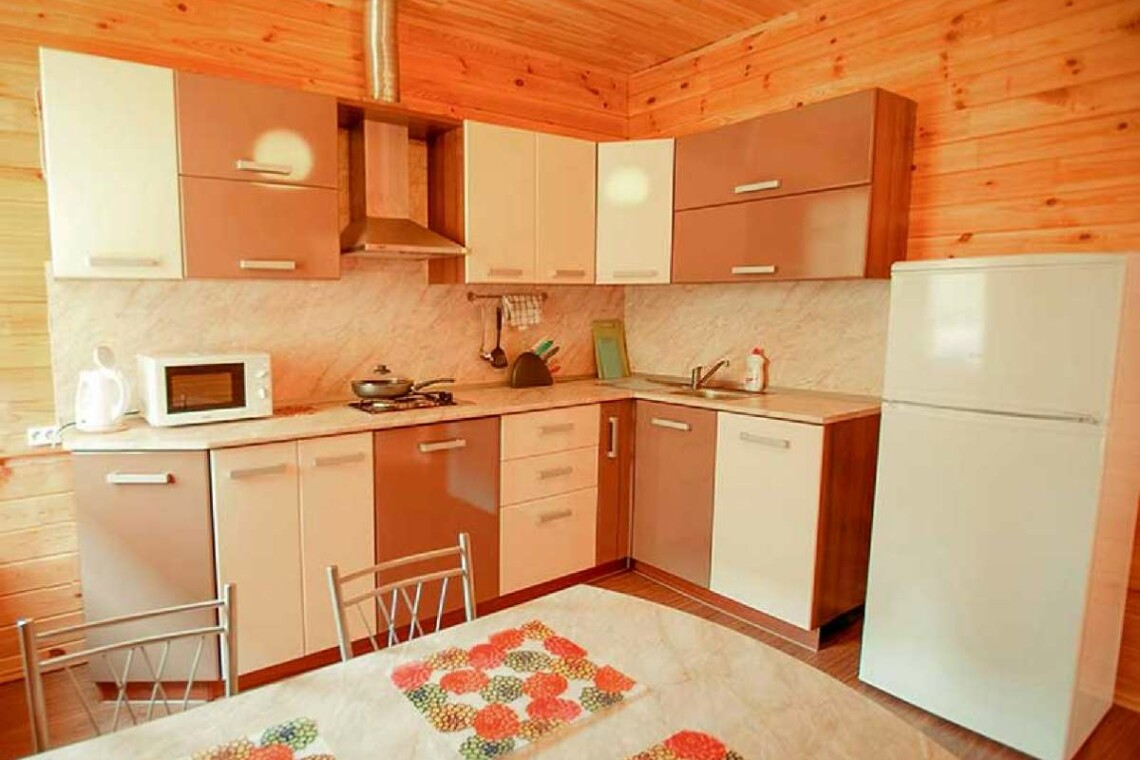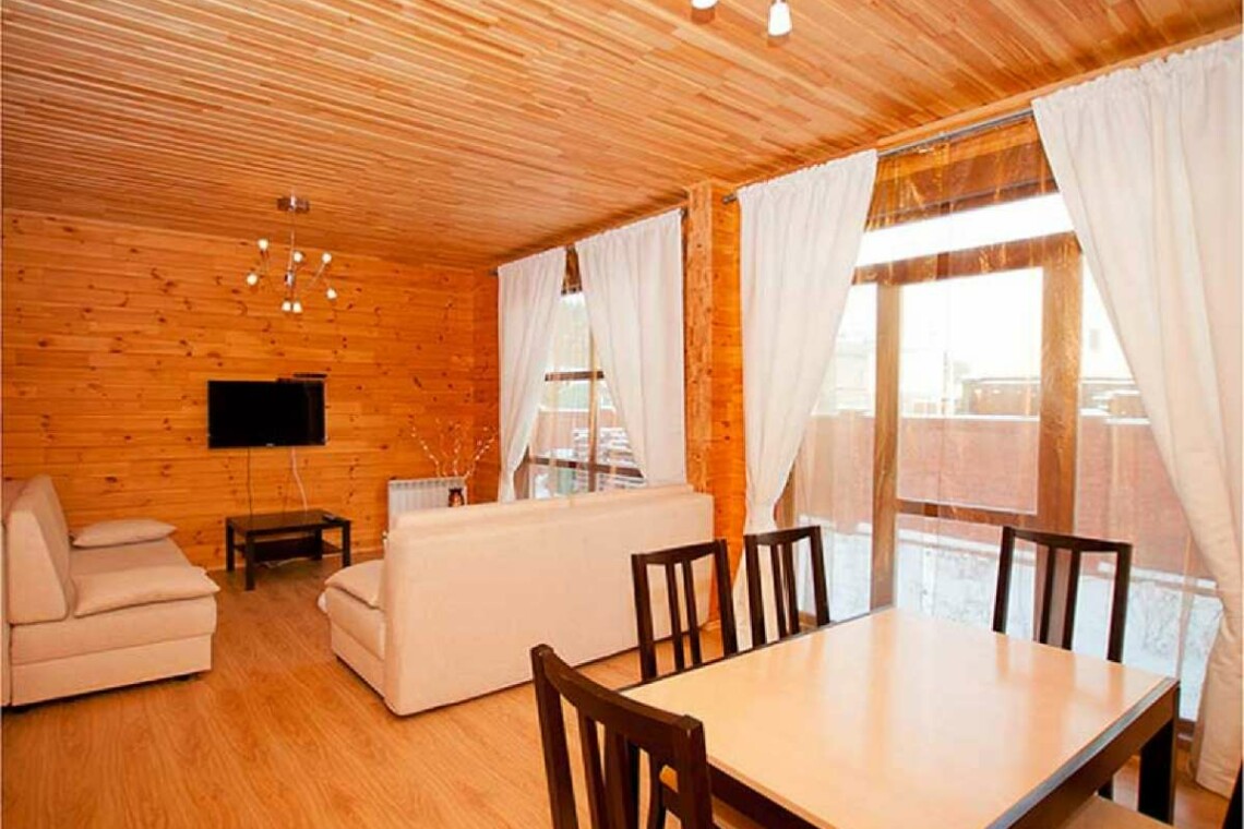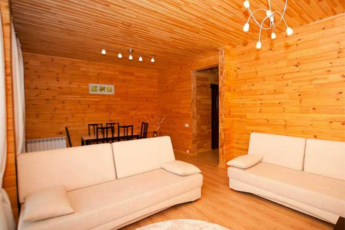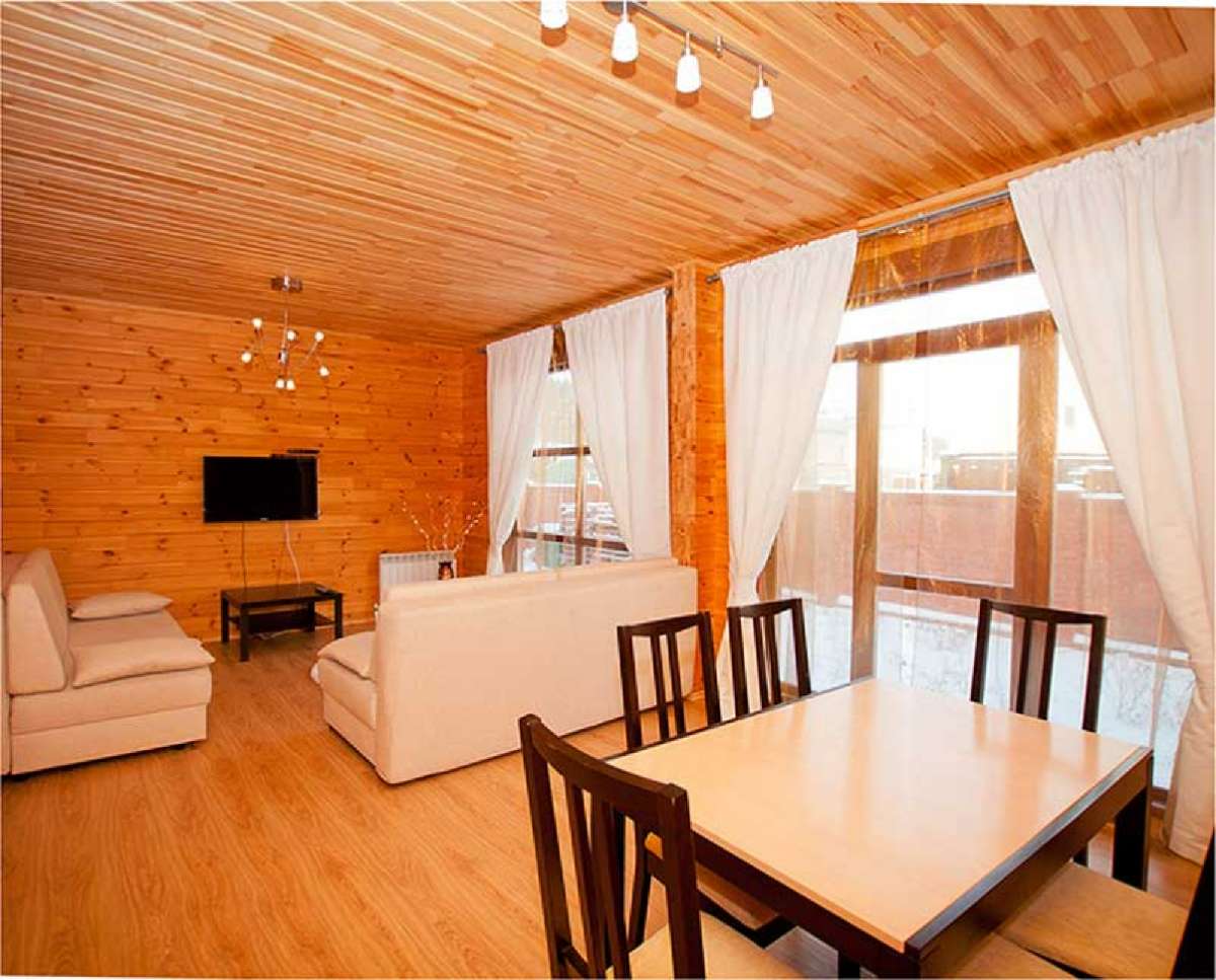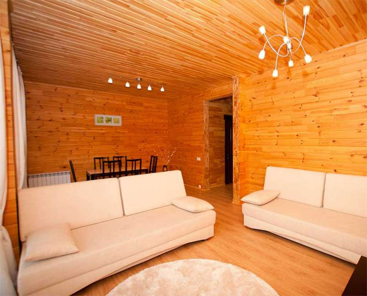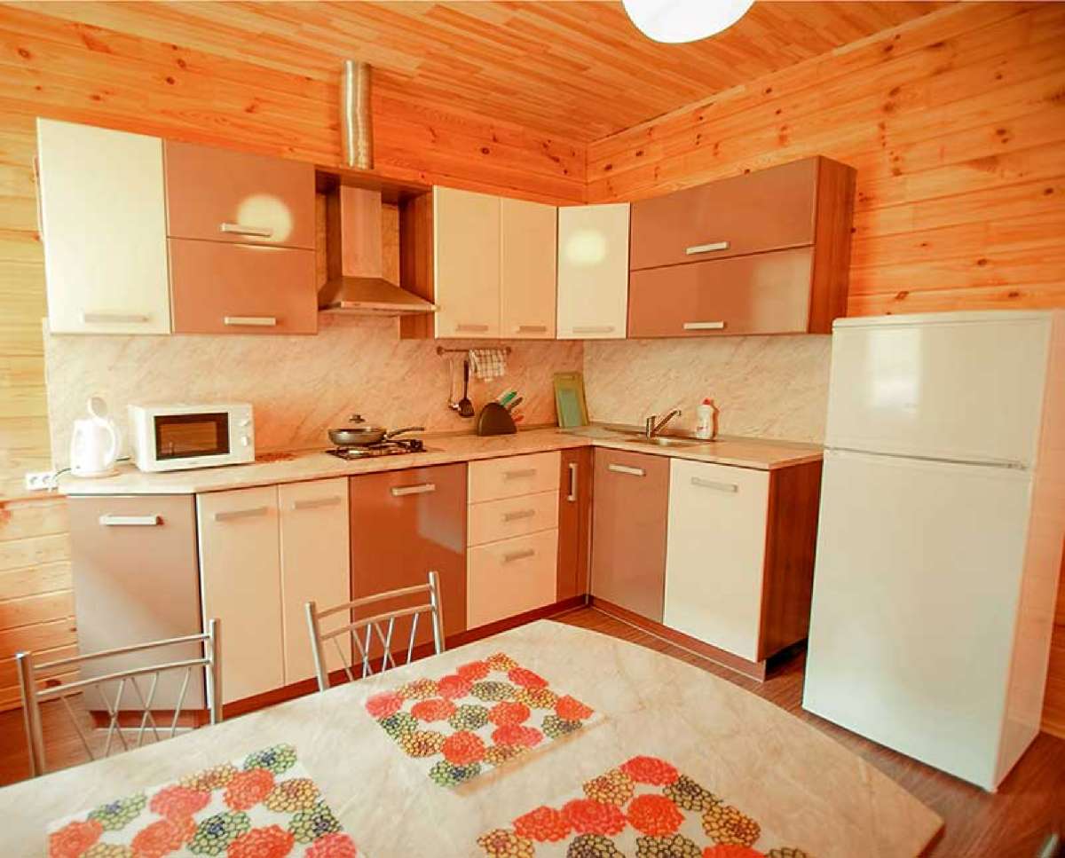 Обстановку отличает комфорт и удобство: просторная светлая гостиная с обеденной зоной, рассчитанной на шесть персон, с возможностью просмотра спутникового телевидения. Удобная кухня с микроволновой печью, холодильником, газовой плитой, электрическим чайником и полным комплектом посуды. На втором этаже расположены две комнаты: в каждой из комнат находятся двуспальная и полутороспальная кровати, а также вместительный шкаф-купе. Для Вашего удобства санузлы размещены на двух этажах, на верхнем этаже ванная комната с удобной душевой кабиной. Наличие бесплатного беспроводного доступа в интернет (Wi-Fi) позволит Вам быть в курсе всех необходимых событий.