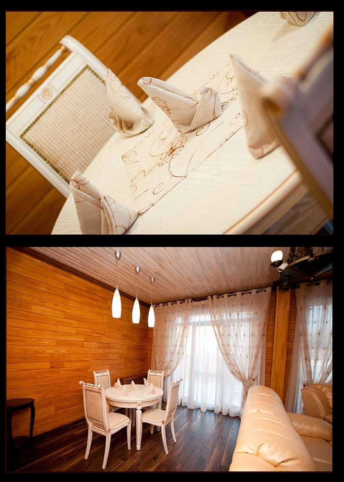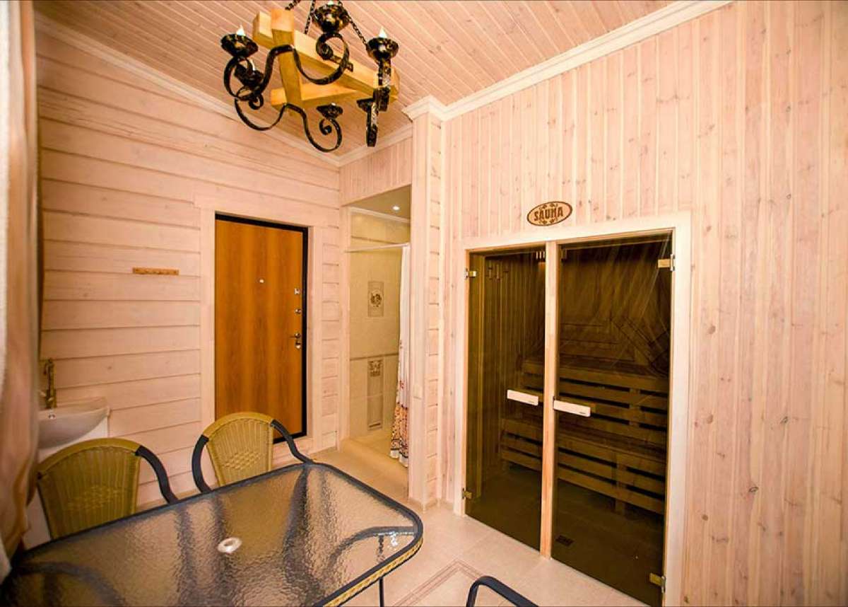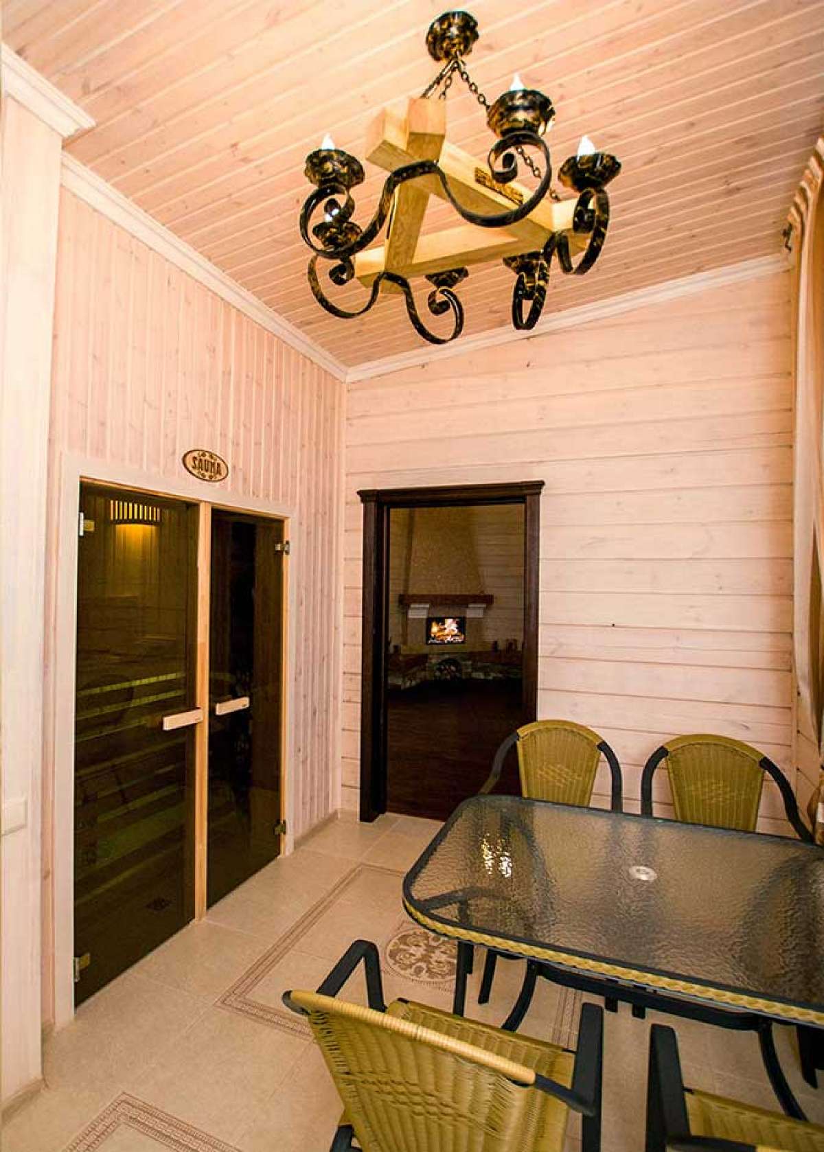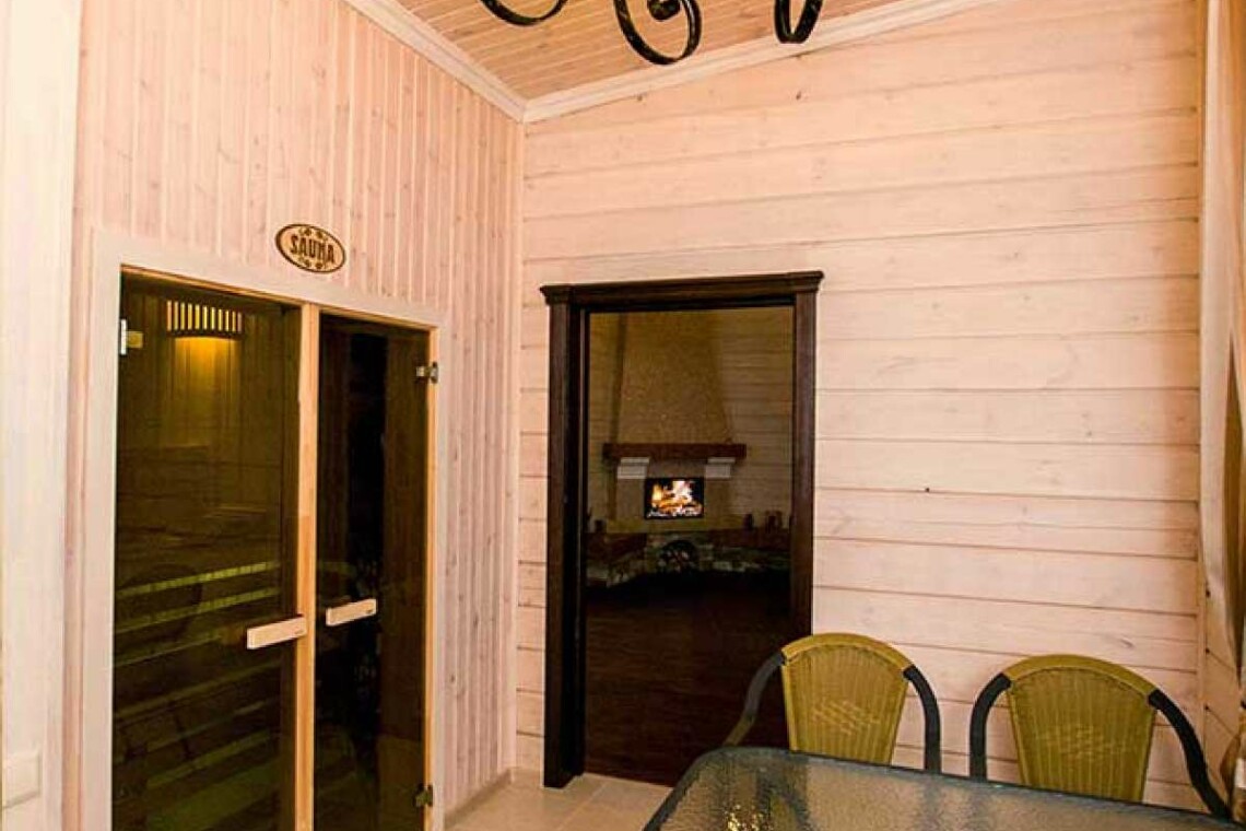 Роскошный двухэтажный дом общей площадью 130 м2 (столовая, гостиная и две спальни) с просторной гардеробной и кухней для приготовления приватных обедов. В гостиной – белый кожаный диван, кресло для релаксации, низкий журнальный стол и обеденная зона. Сочетание респектабельной классики и современных дизайнерских элементов. Обилие изысканных светильников позволяет создать нужную атмосферу. В гостиной спутниковое ТВ с широким плазменным телевизором, бесплатный проводной и беспроводной интернет. Две ванные комнаты, одна из них с изысканной ванной на ножках, вторая с просторной душевой кабиной. На втором этаже удобное рабочее место. А также уютная каминная и великолепная сауна.