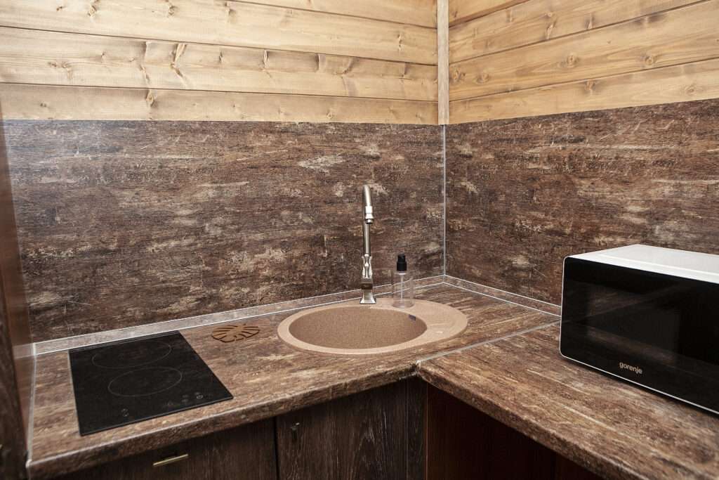⁃ оборудованная кухня (подача воды, микроволновая печь, набор посуды, электрочайник, холодильник);