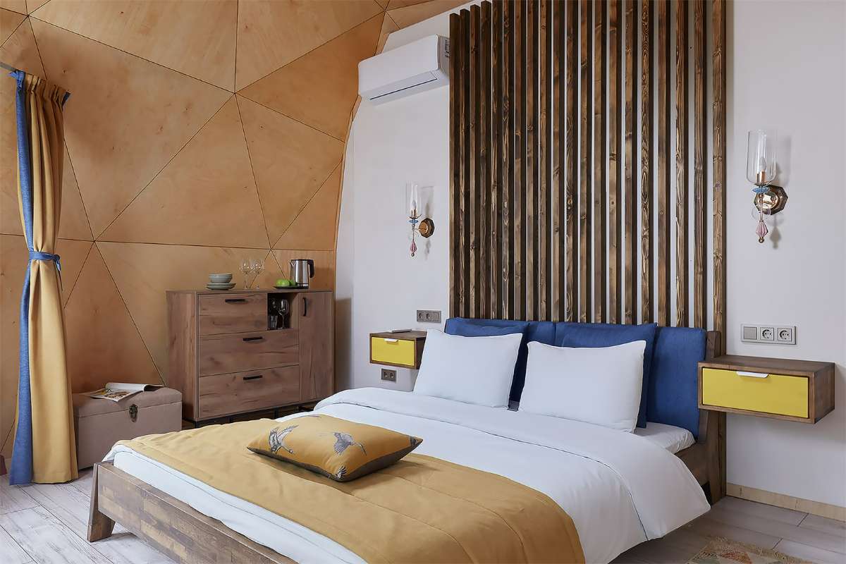 Восстановить силы, выспаться, сменить обстановку и вырваться из четырех стен в прямом смысле можно и нужно, выбрав для отдыха отдельно стоящий номер в форме купола. Необычная конструкция номера площадью 30 кв.м. и высотой около 4 м позволит испытать новые эмоции. Купол построен на деревянной веранде площадью 80 квм и рассчитан на круглогодичное проживание. Обогревается с помощью инфракрасного пола, на случай жары предусмотрен кондиционер. В куполе есть набор посуды и чайник. В ванной комнате – душевая кабина, санузел, раковина, фен, набор полотенец. Воду подогревает бойлер. Рядом с каждым куполом установлен мангал. Для Гостей, проживающий в куполах, предусмотрена отдельная парковка. В теплое время для отдыха можно расположиться на открытой веранде, а в непогоду – любоваться пейзажем через огромное окно. До основного здания отеля, ресторана и до берега реки – четыреста метров. Купола – самые уединенные номера нашего комплекса. Это самое лучшее место для романтического отдыха. Проведите время без телевизора, интернета, новостей, соседей за стеной. Посвятите эти редкие моменты себе и близким.